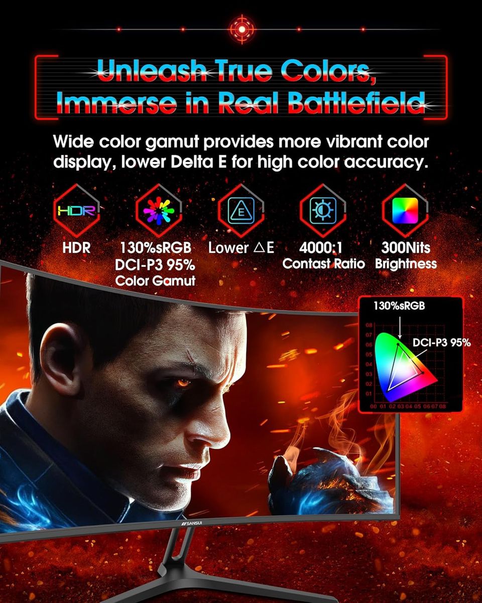 Cinematic Color Accuracy: 130% sRGB & DCI-P3 95% color gamut, 4000:1 contrast ratio, 300nits brightness, HDR, Anti-flicker; Anti-Glare.