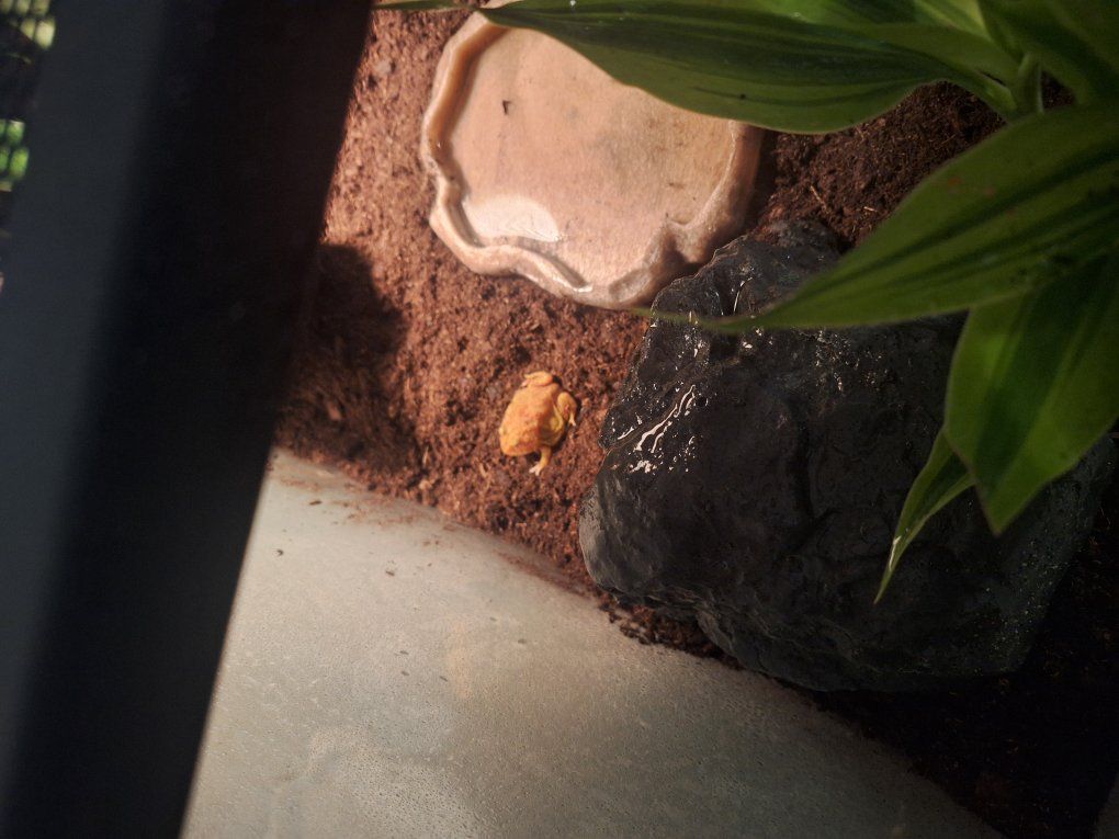 pacman frog (juvenile) in a 15 gallon tank. comes with light, tank, everything inside the tank, worms, and calcium powder