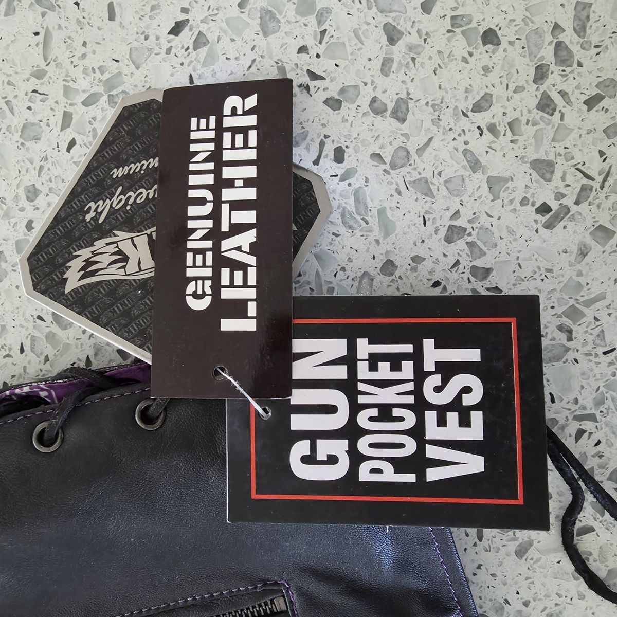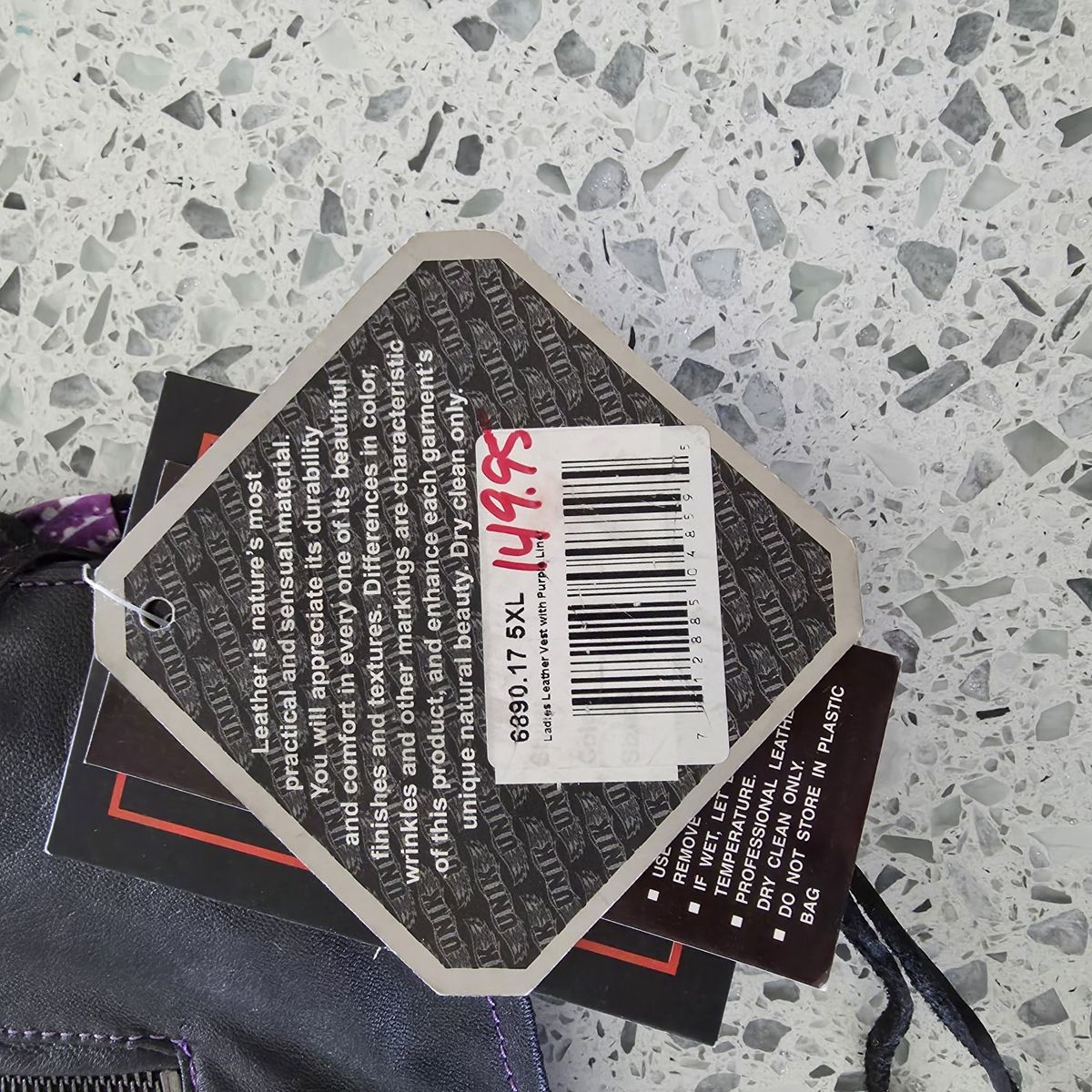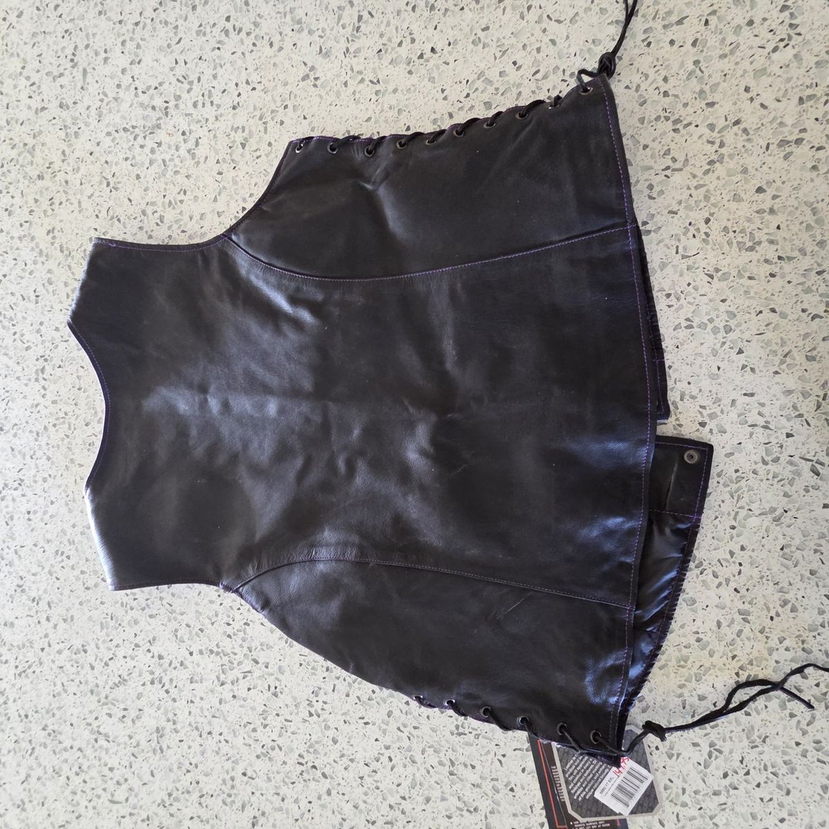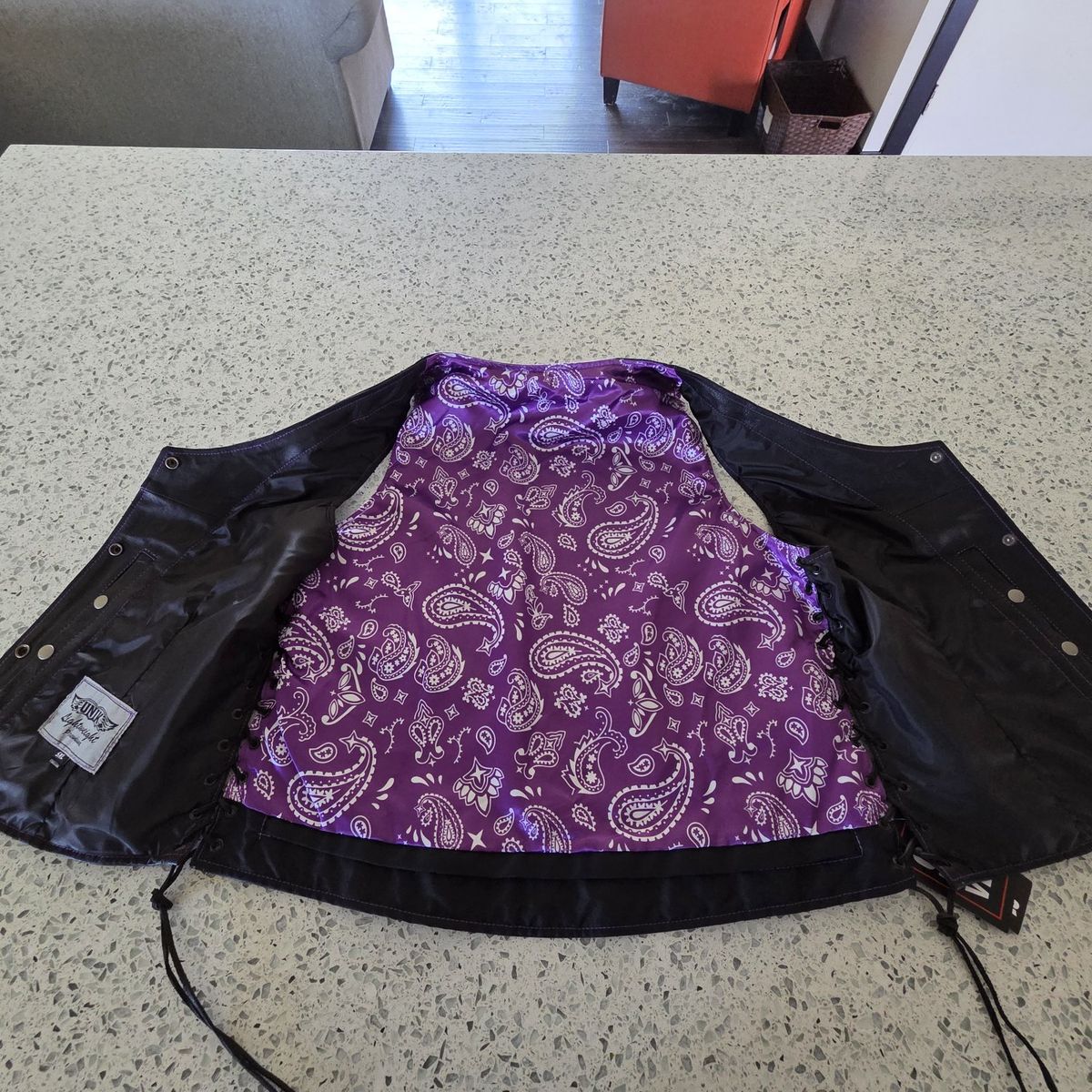 Brand new leather vest with purple paisley interior and purple stitching. Sides are corset laced for room to expand. Its a 5XL but fits like a XL or a small XXL (room for the girls)