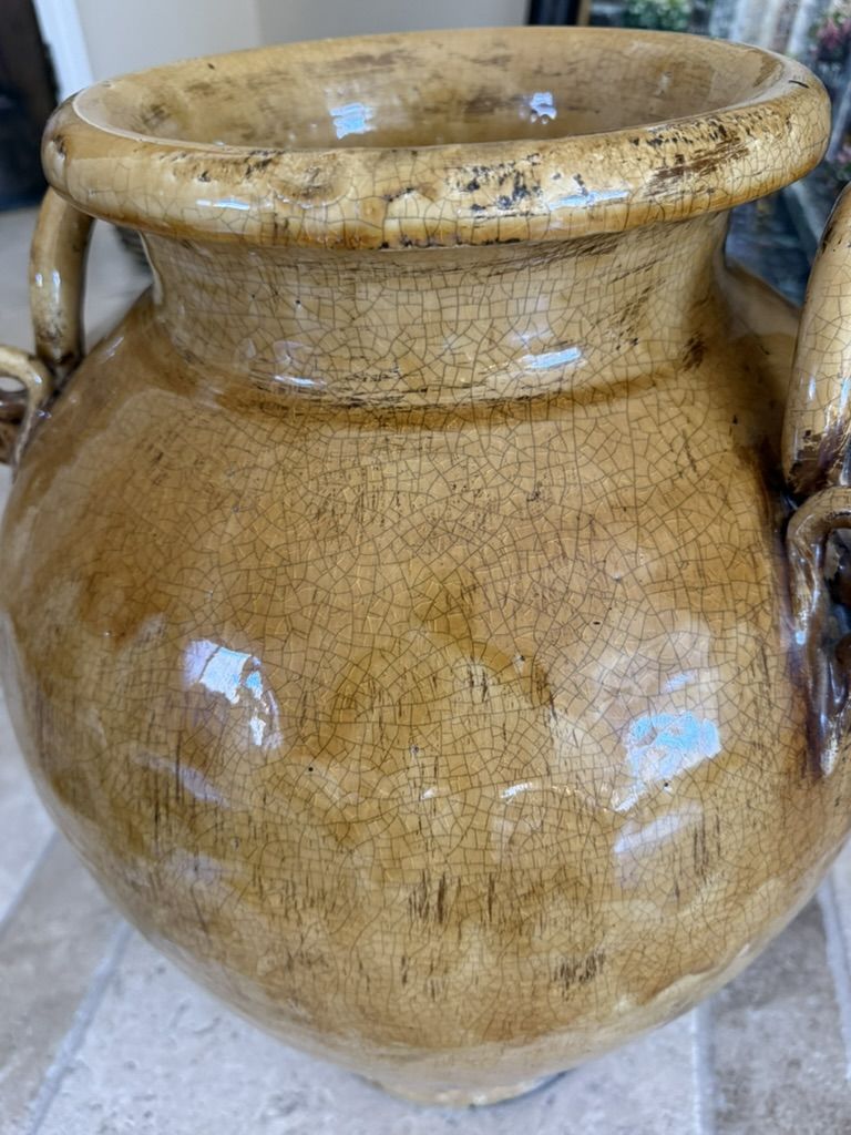 Venmoeautiful, large 22-inch tall glazed clay ceramic pot with a warm honey, caramel finish. This piece has a timeless old-world Mediterranean / Tuscan style with a softly aged look, crackled glaze detail, and decorative double-scroll handles on each side. 15' wide body. approximately 25-30 lbs. only used inside, so in great condition. $90 OBO