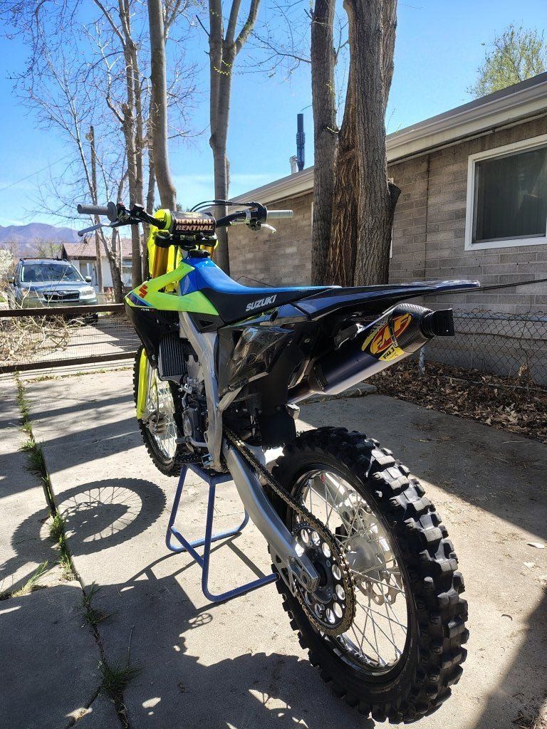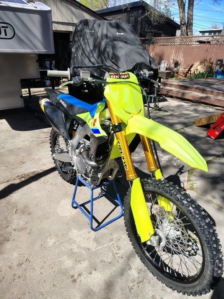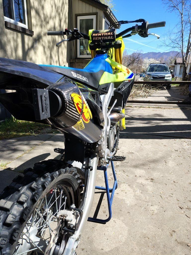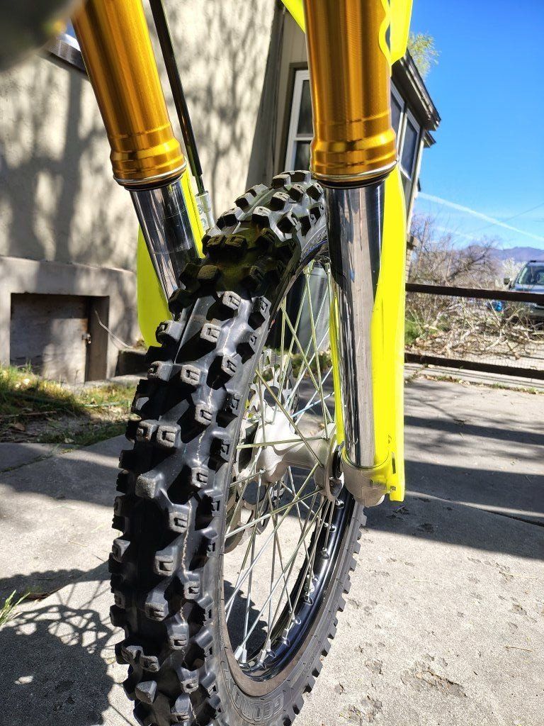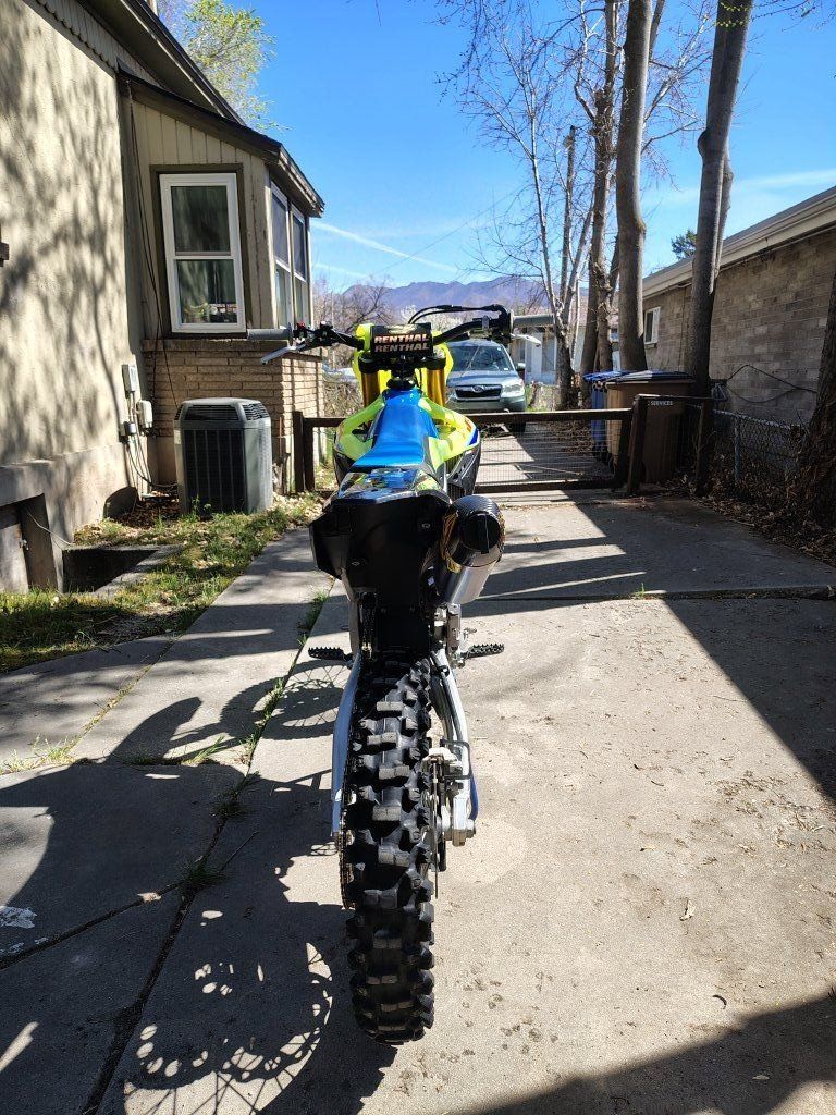 bought new, good bike, mainly trail and desert use, been to the track a few times, I just don't need a 450 anymore. put the full exhaust on and different grips, stock bike, fresh fork seals and maintenance. comes with a paddle tire.