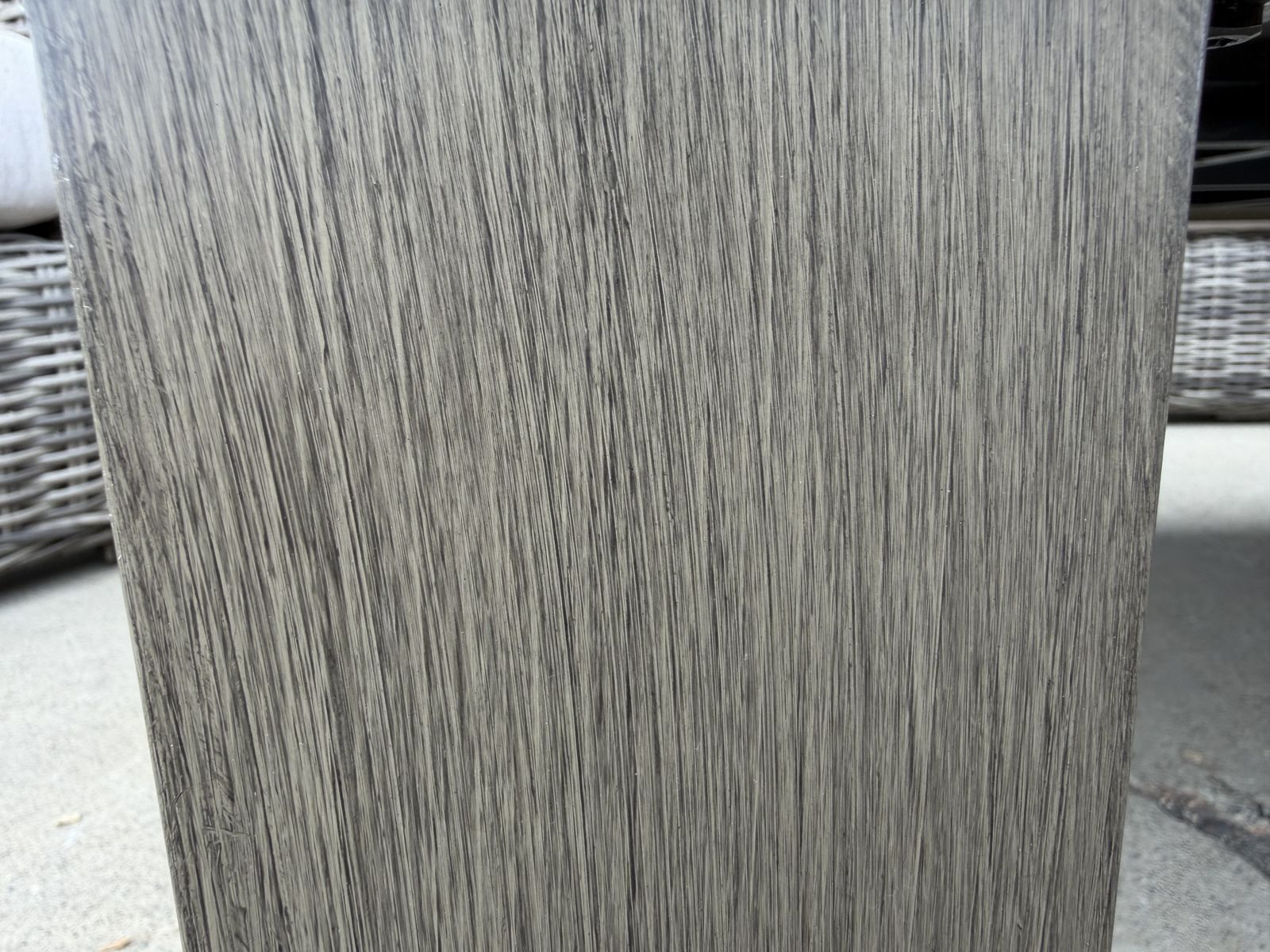 The centerpiece of the Halstead set is the 107-inch three-person sofa. The sofa's generous size is complemented by a large format porcelain tile table that perfectly balances the oversized lounge chairs and sofa. The hand-applied faux wood finish harmonizes well with the variegated large-scale wicker threads, while the large aluminum tubes pay tribute to traditional mission-style design.