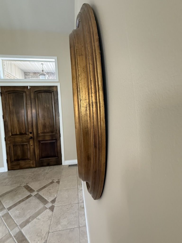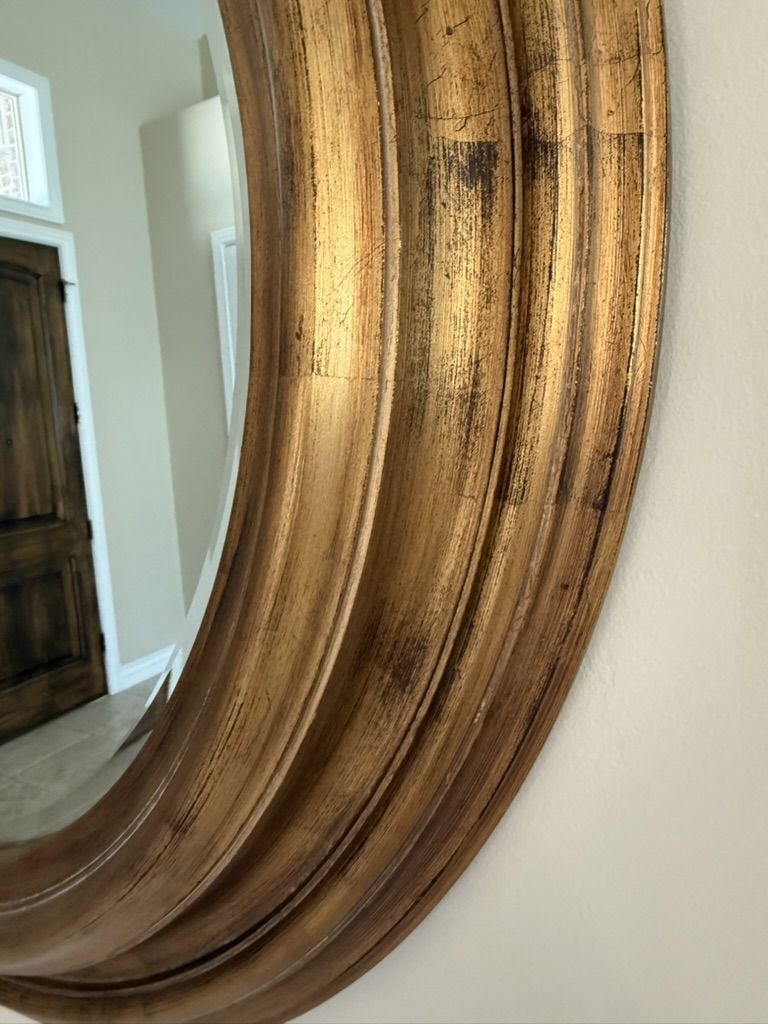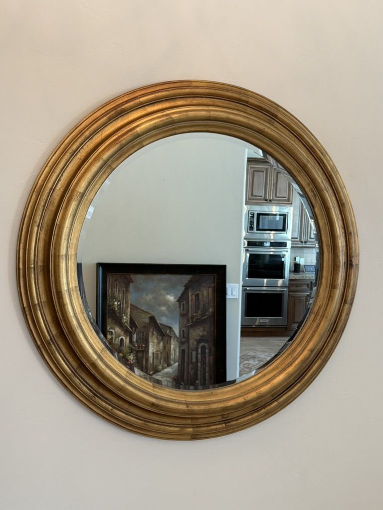 VenmoDecorative round mirror. Has a beautiful antique gold finish. 33.5 inches diameter and frame is 3.5 inches thick. Weighs about 25 lbs. Beveled mirror glass.