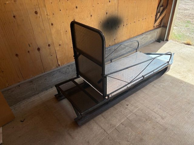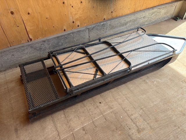 Folding towable snow sled for towing behind a snowmobile. Very convenient for transporting your totes full of food/belongings to your cabin. Diamond plate aluminum base and vertical back. Excellent condition.