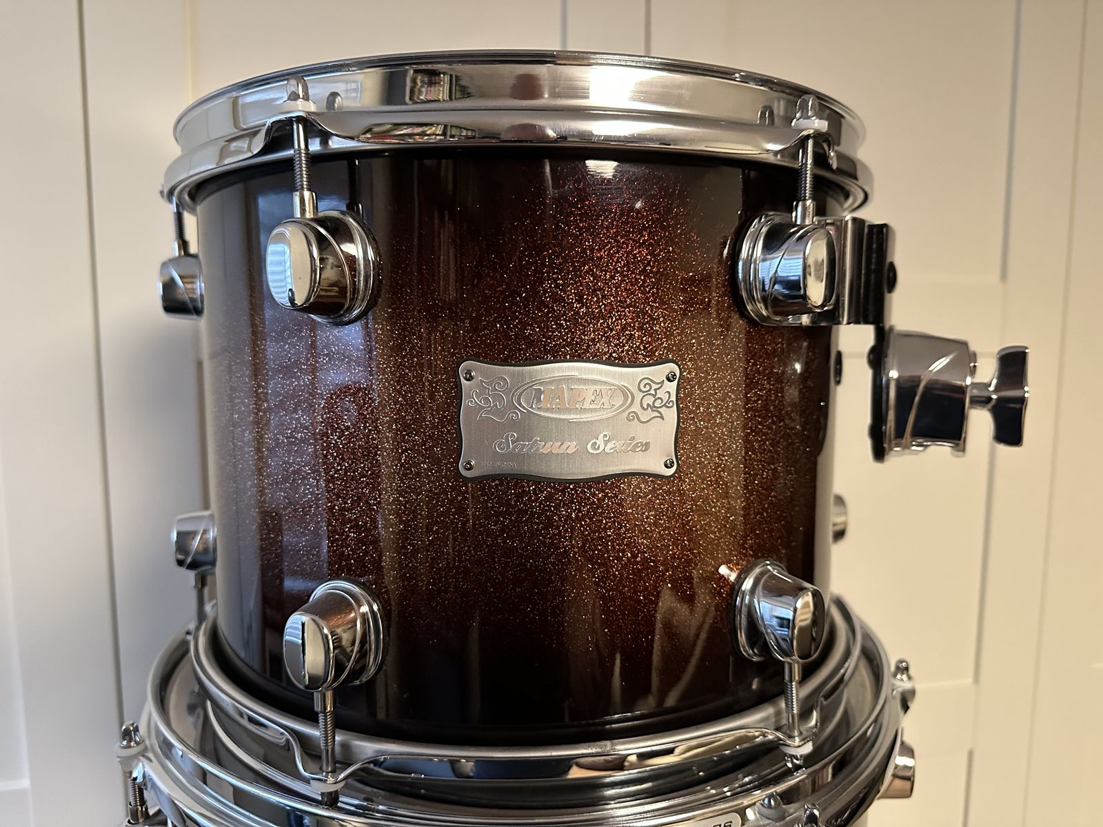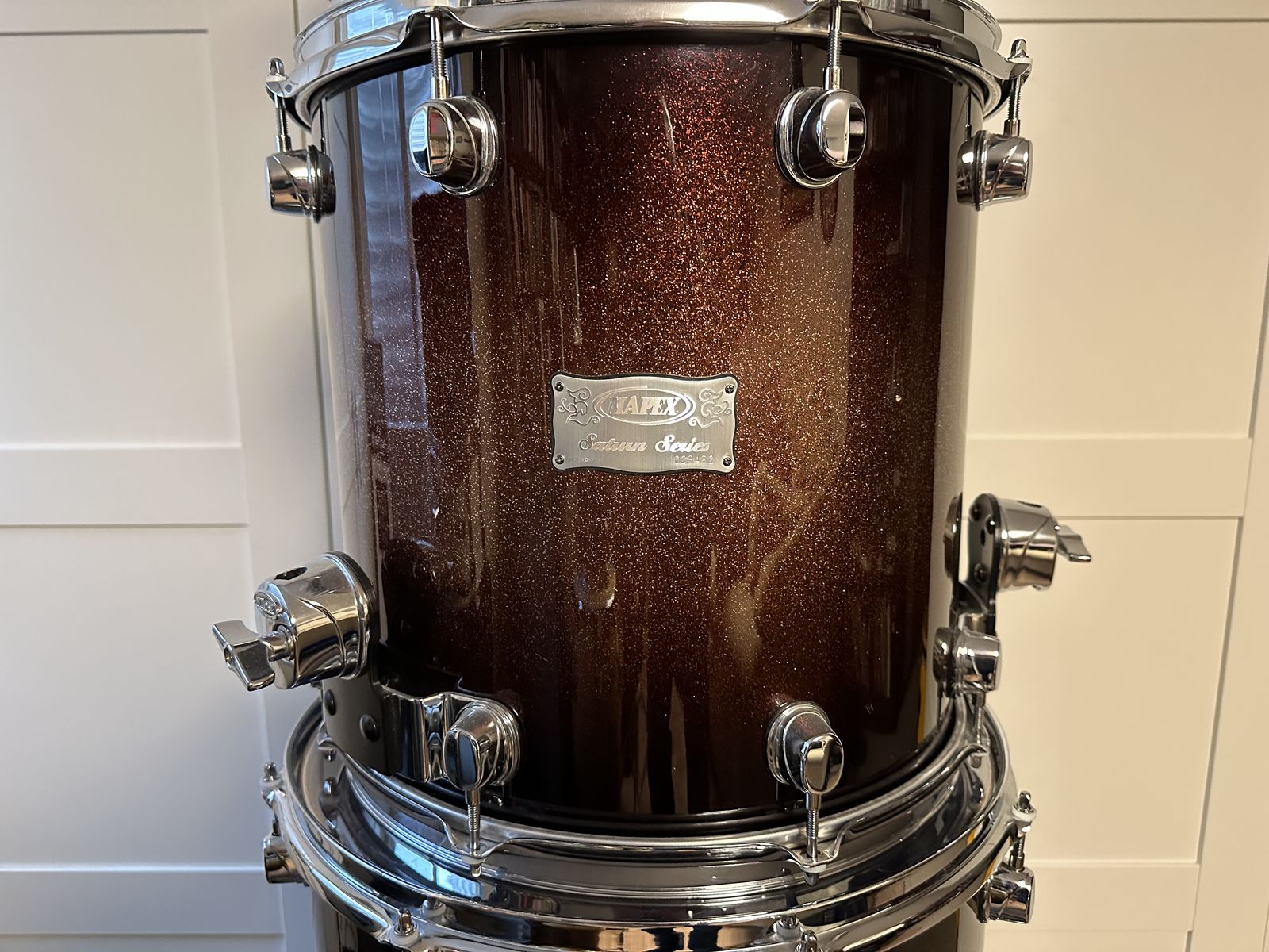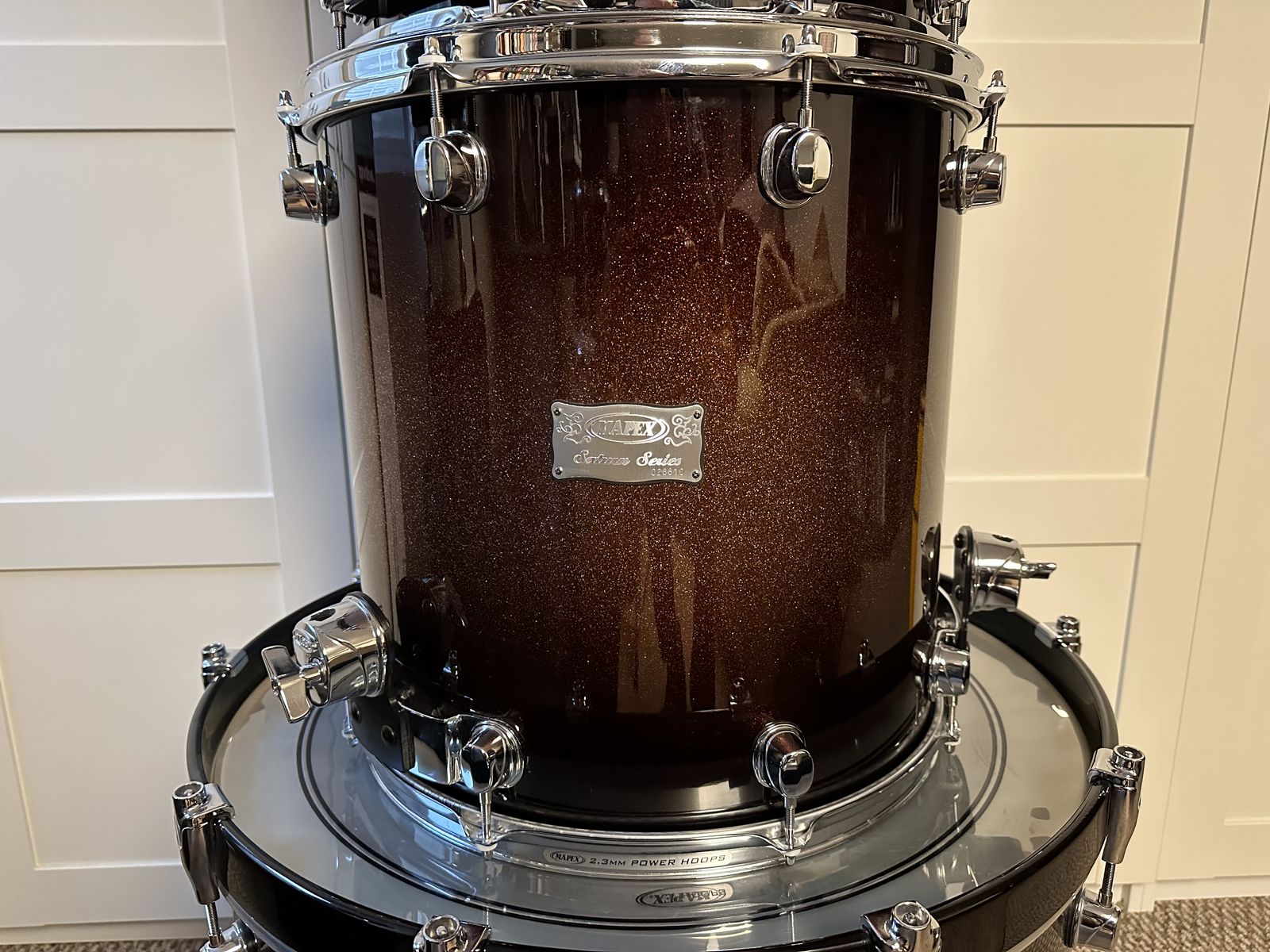 Venmo24x20 kick, 16x16, 14x14 floor toms, 12x9 rack tom. Shells are super thin inner walnut/outer maple plies.