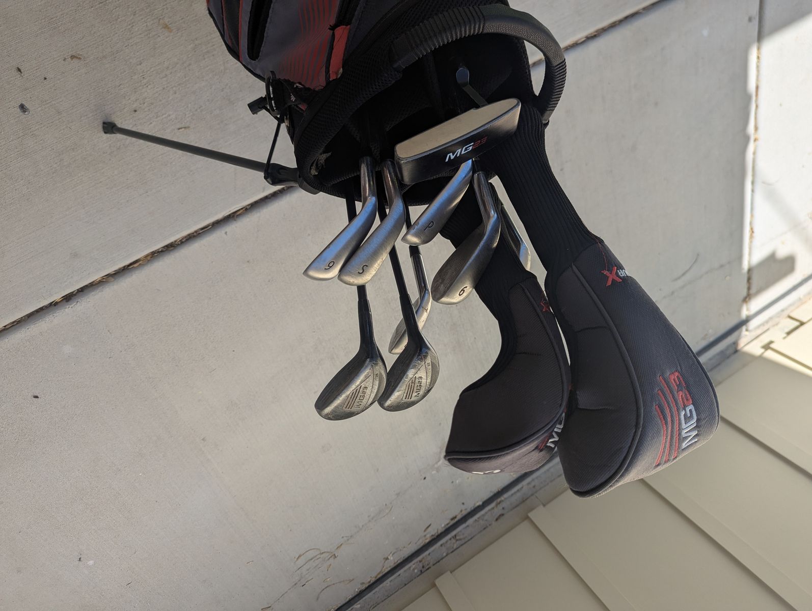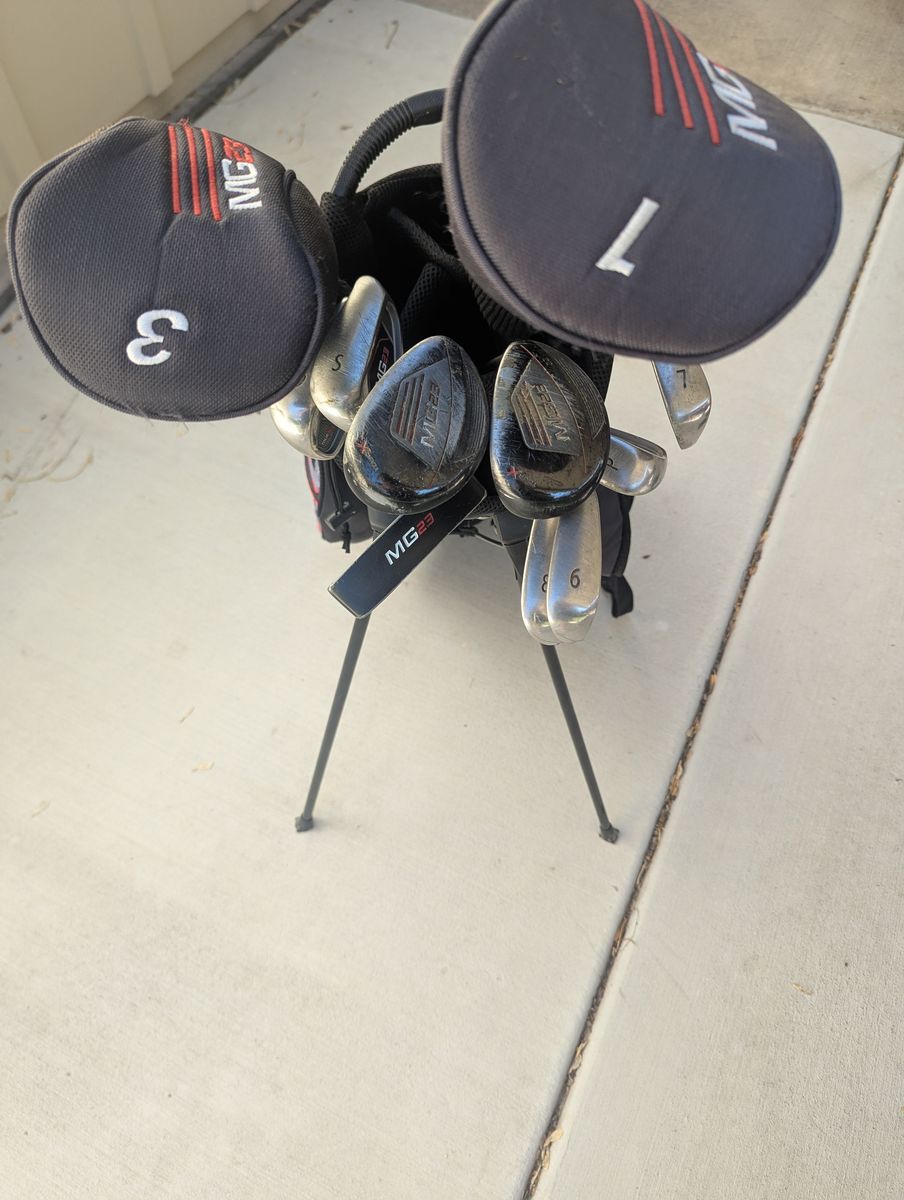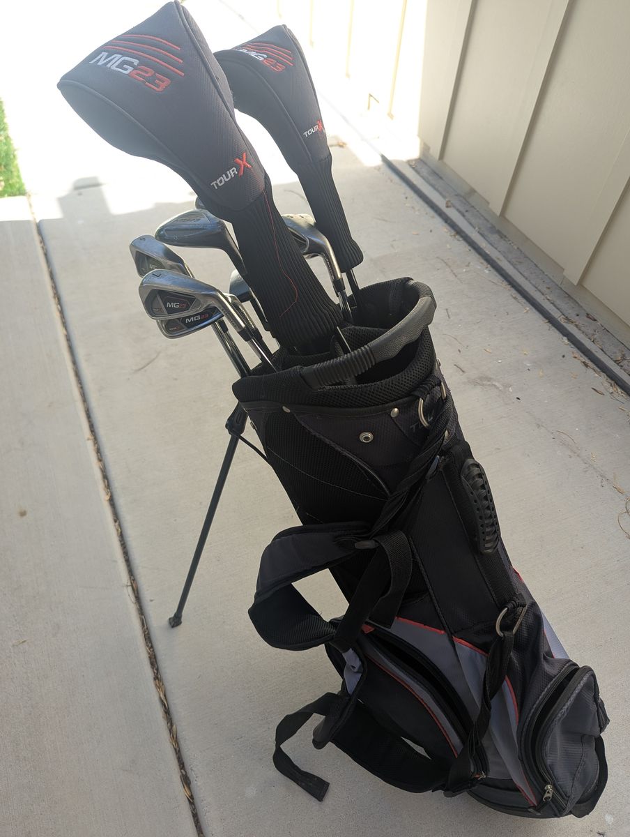 VenmoTourX mg23 golf set including bag, 6-pw irons, 4H, 5H, 3 wood, driver, SW, and putter. Includes head covers for the driver and 3 wood. Standard length, lie, loft, and flex. Good starter set for the average beginner golfer. Includes some small scratches on the hybrids, wood, and driver, but nothing that would affect their performance.