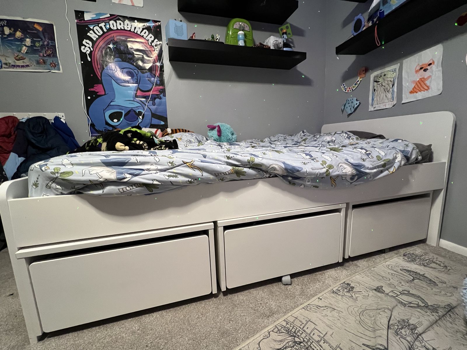 ApplePayIKEA SLÄKT twin bed frame with THREE matching SLÄKT storage boxes (the rolling drawers with casters). White. Super clean and in excellent condition! No mattress included (just the frame + 3 drawers) Non-smoking home Originally bought new for ~$560 (bed frame $169 + 3 storage boxes ~$120 each) Asking $250 firm (cash or Venmo/Apple Pay The bed frame has a slatted base (no box spring needed). The three storage boxes roll out easily and give tons of under-bed storage — perfect for clothes, toys, blankets, etc. Easy to disassemble and move. Current photo shows it set up in my kid’s room. Also including IKEA photos as well. Pickup only in Ogden area. No delivery. Message me with any questions!