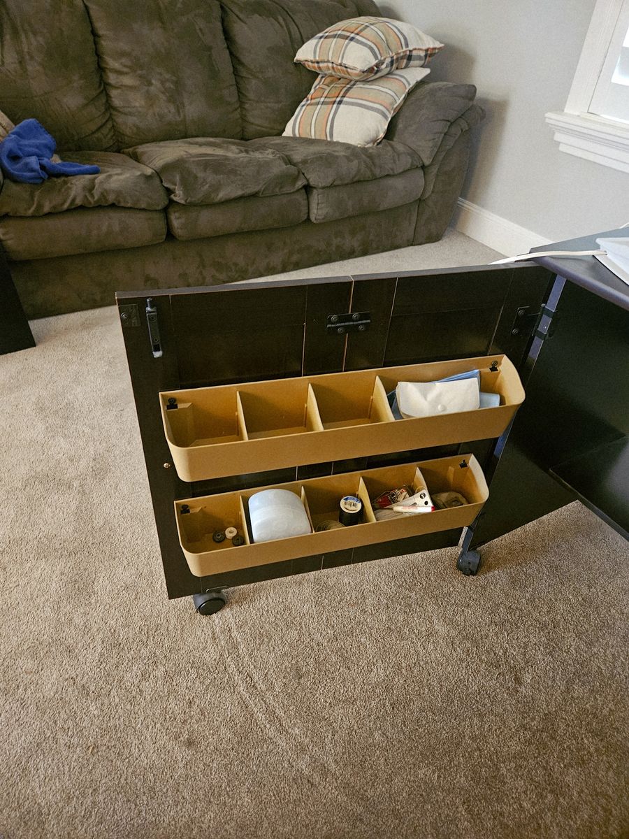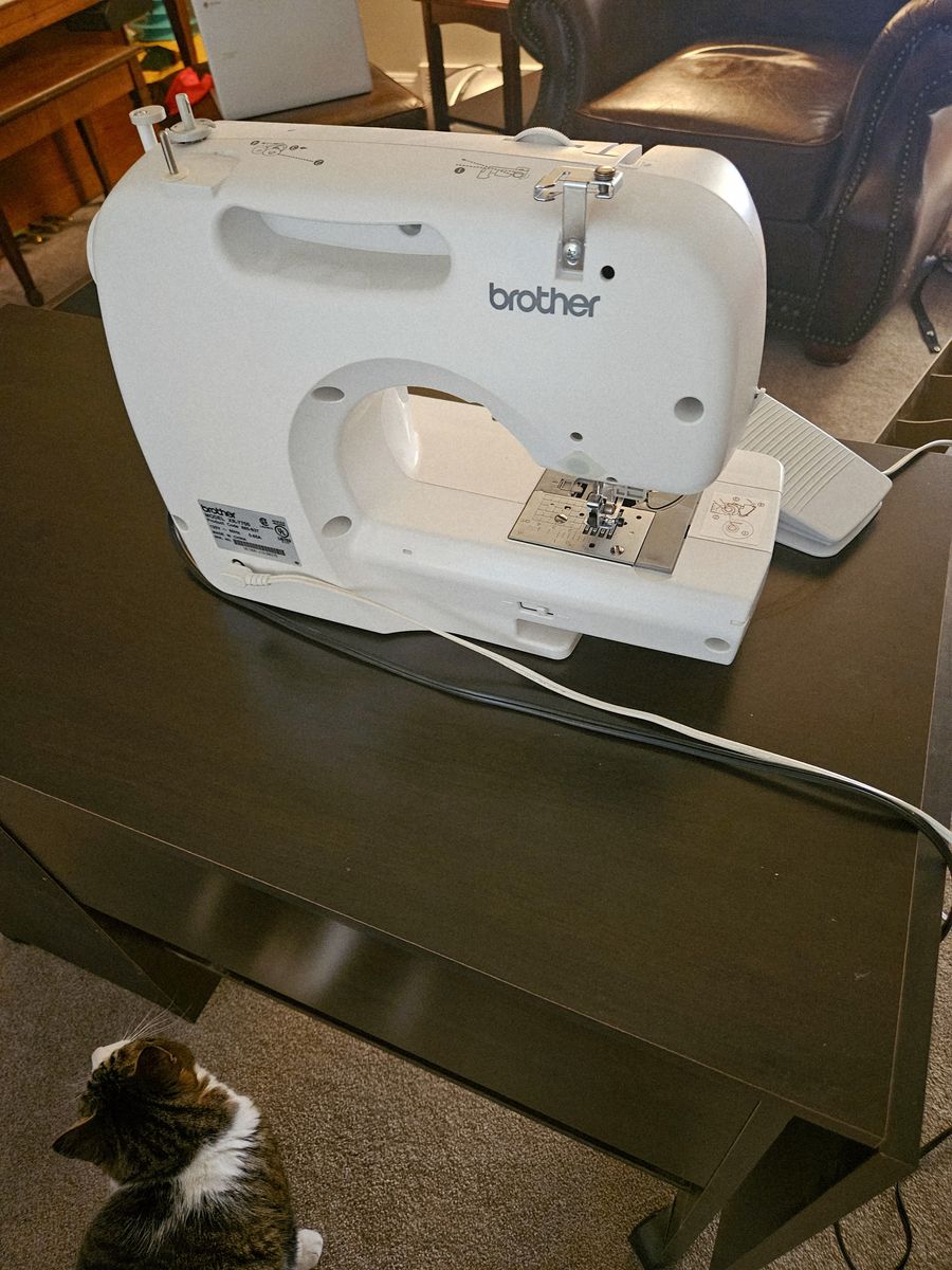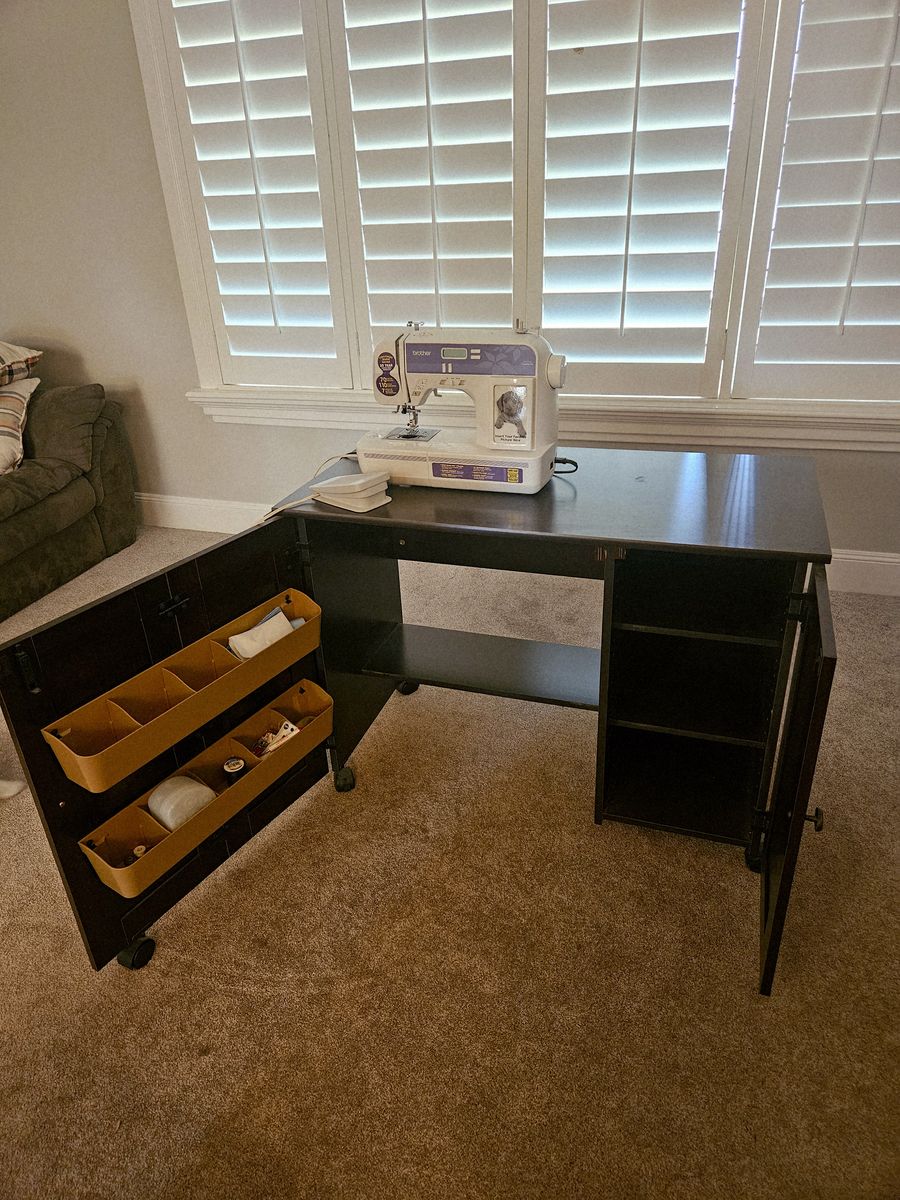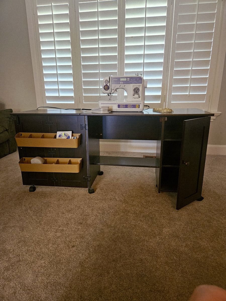VenmoBrother XR 7700 sewing machine. It's in excellent like new condition, used maybe 5 times since I purchased it. The table is in excellent condition as well, no nicks and a fully functional fold up extension. Large surface area-excellent for any size projects! Comes with 2 rows of caddies, instructional dvd, and multiple storage shelves. Table is 28" high, 38" long, and 19"deep. The fold up panel adds 23.5" to the length.