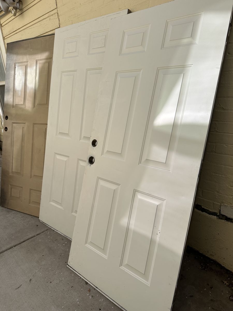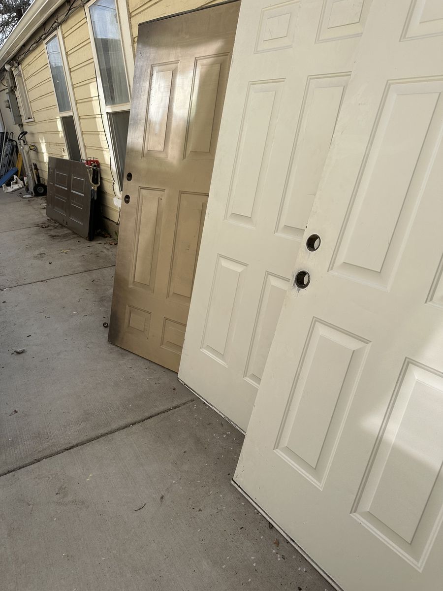 Outdoor metal doors, four of them they are 36 inches wide and between 79 inches and a half and 80 inches tall. They are all used with minimal scratches. There is one that has two holes that have been drilled through it. $50 per door.