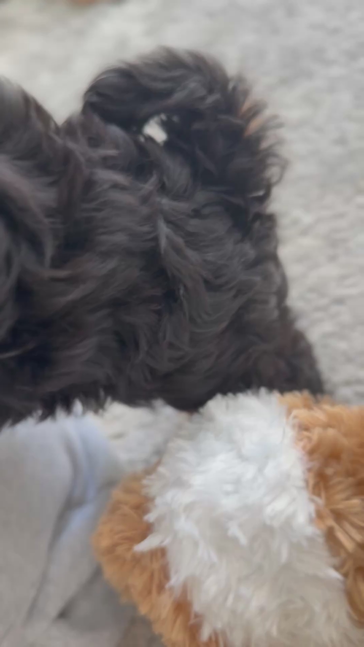 Meet Terence, he is our tiny boy of the litter with the most gorgeous deep tan/rust markings. He is Phantom abstract with splashes of white and has a thick, soft, wavy coat. Terence has the cutest round teddy bear face that will melt you. He has a tender heart and leans into you when you hold him but also has a cute playful side.