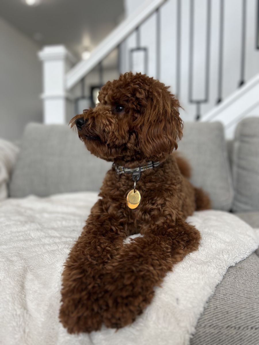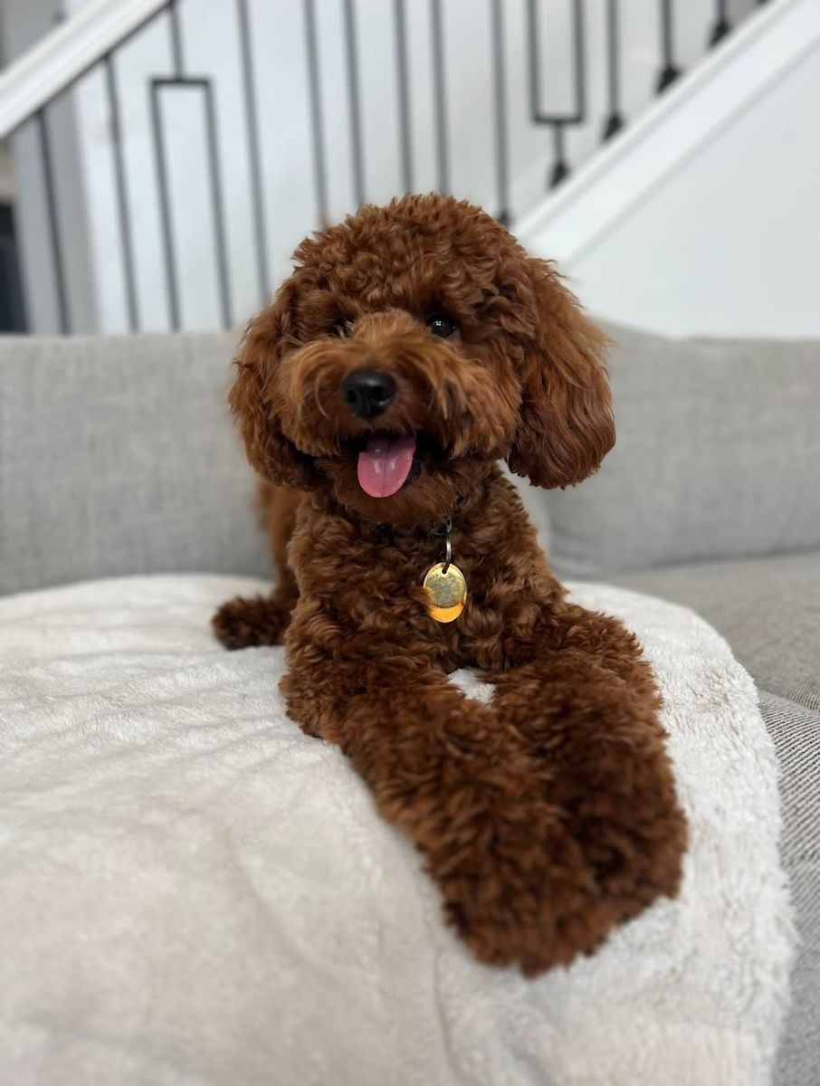 He's a 15 lb. Multigenerational Toy Goldendoodle. He has the sweetest, calm temperment, loves all people and other dogs. His puppies are deep red and with the right female, beautiful deep reds with white markings