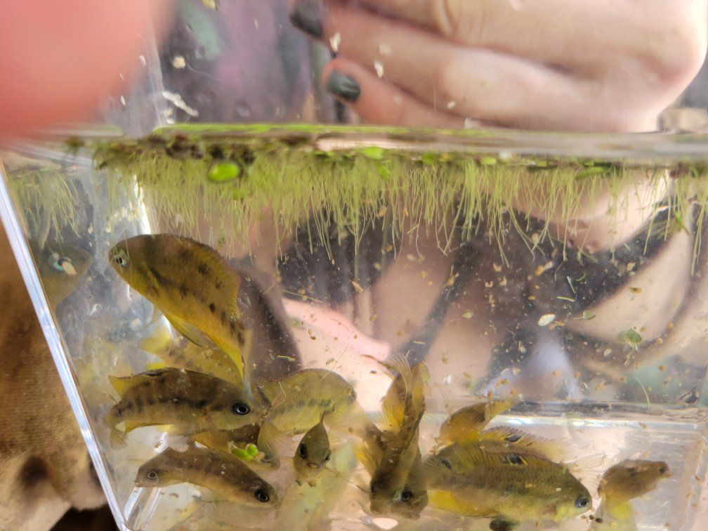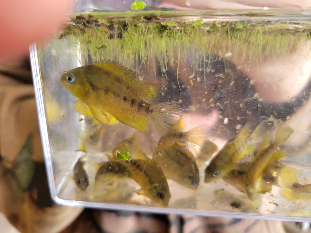 Zelleyellow cichlid with blue eyes and black stripes, image of parents juvies are around 1.5" to 2". The parents share a tank with other cichlids. No problems as of yet.