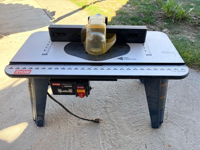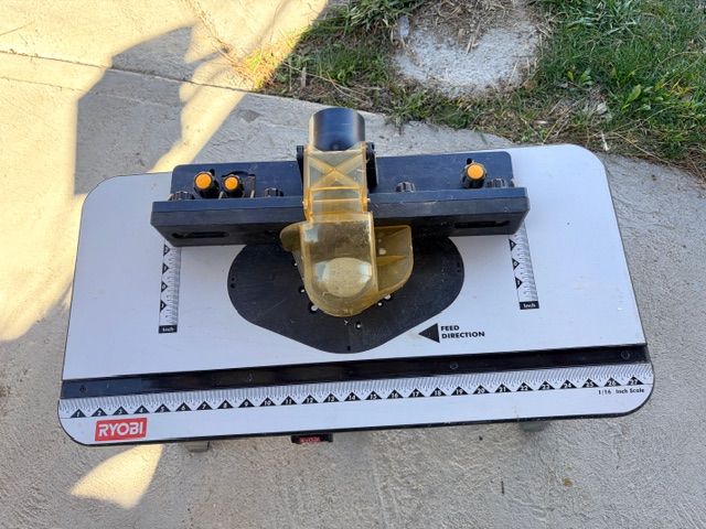 Brand new router table. Router not pictured here, but we also have a router for sale that you can use with this table. If you call about the table, ask about the router. Also, brand new.