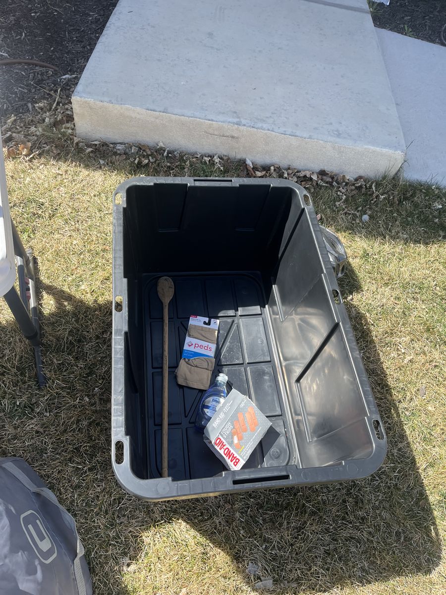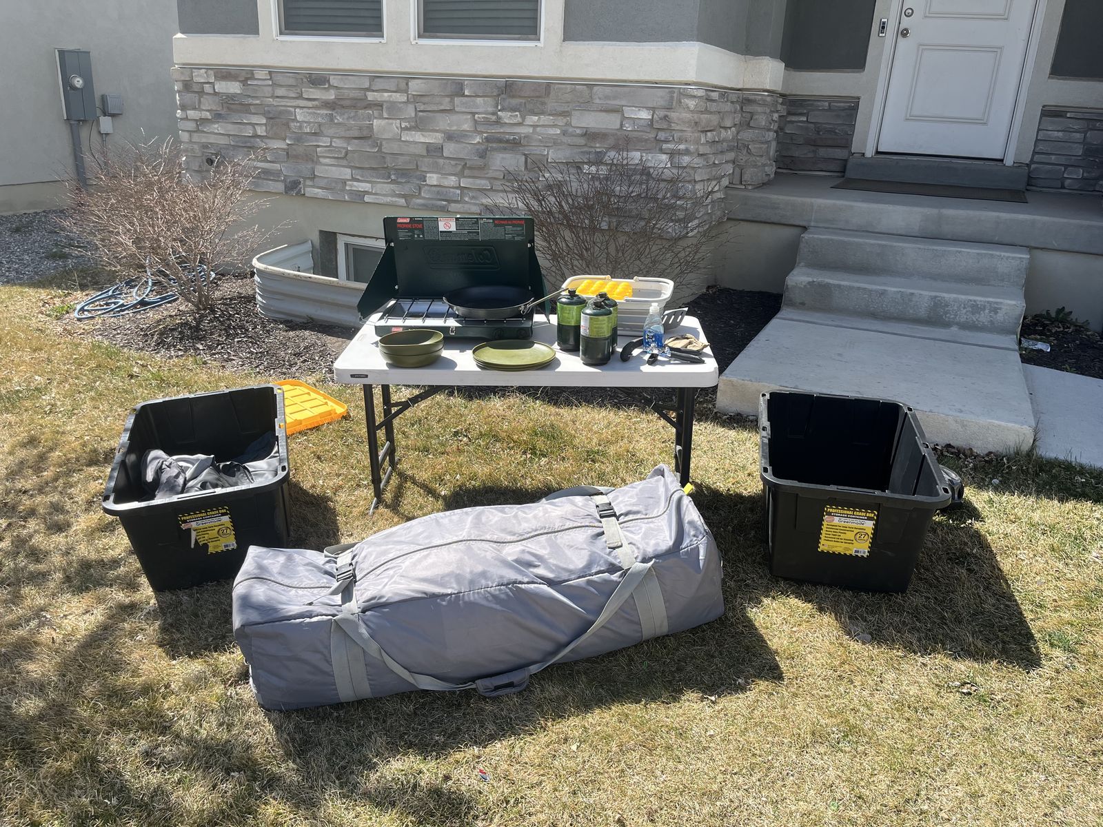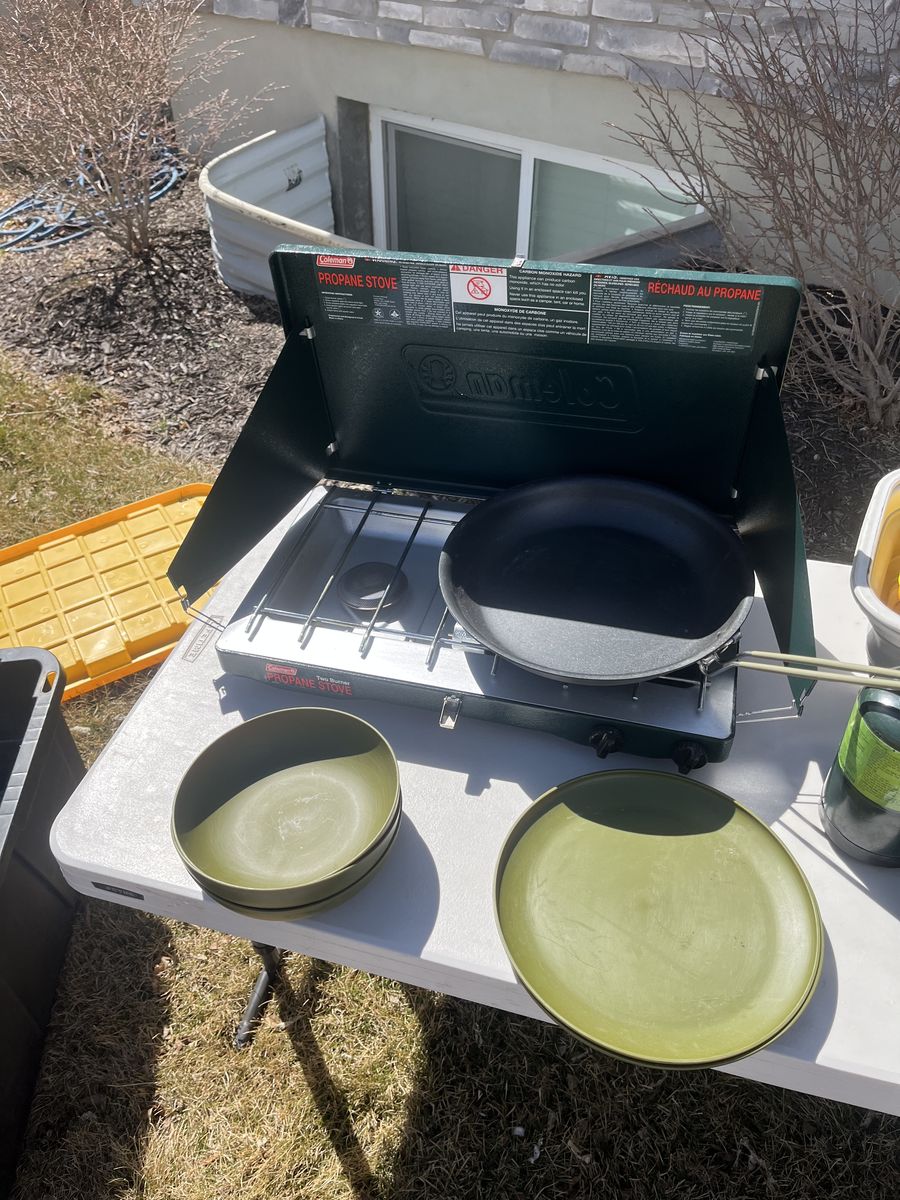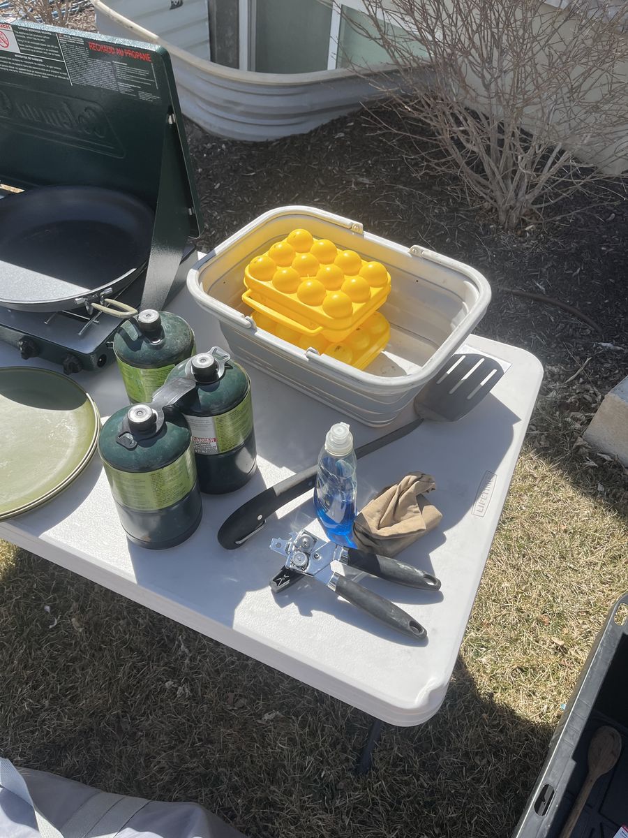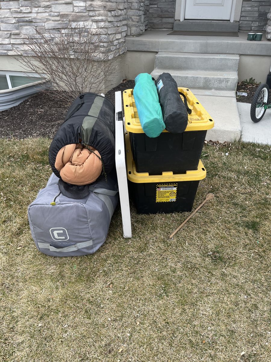 If you are looking to get into camping but not sure where to start, what to get, or can’t imagine spending the amount of money it takes to get a full outfit, look no further. Here is a complete camping setup for you and your family! Comes complete with a 12 person core tent that can be put up with 1 person! (Plus tarp that goes under the tent) Queen size sleeping bag that is rated for 0 degrees. Queen size air mattress (I’m 95 percent sure it’s one without a hole 🤞) at least it didn’t when I used it the last time. Plus the air pump to go with it. 2 camping chairs, a Coleman 2 burner propane stove with 3 propane canisters. 3 plates, 3 bowls, a collapsible washing container, camping frying pan, a spatula, can opener, and egg container. The two black storage totes are yours as well to stay organized with room to add more gear as you need it! Table in the photo also comes with this set! Be ready to go camping this year with the confidence you need that you have everything you need to enjoy the great outdoors!