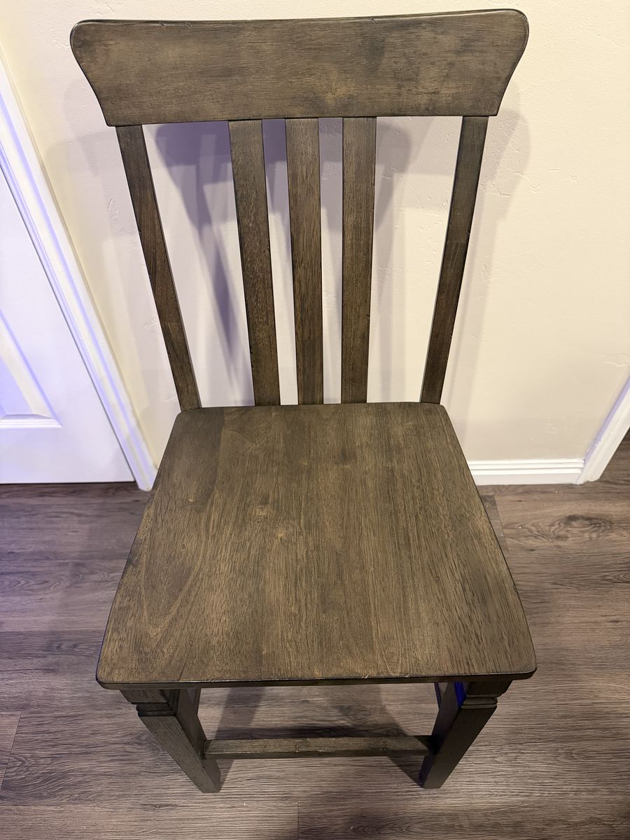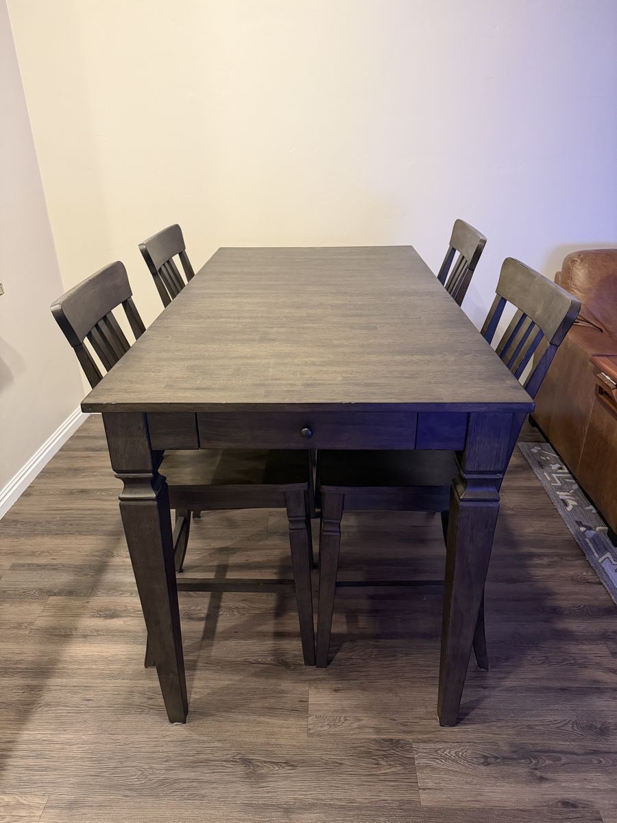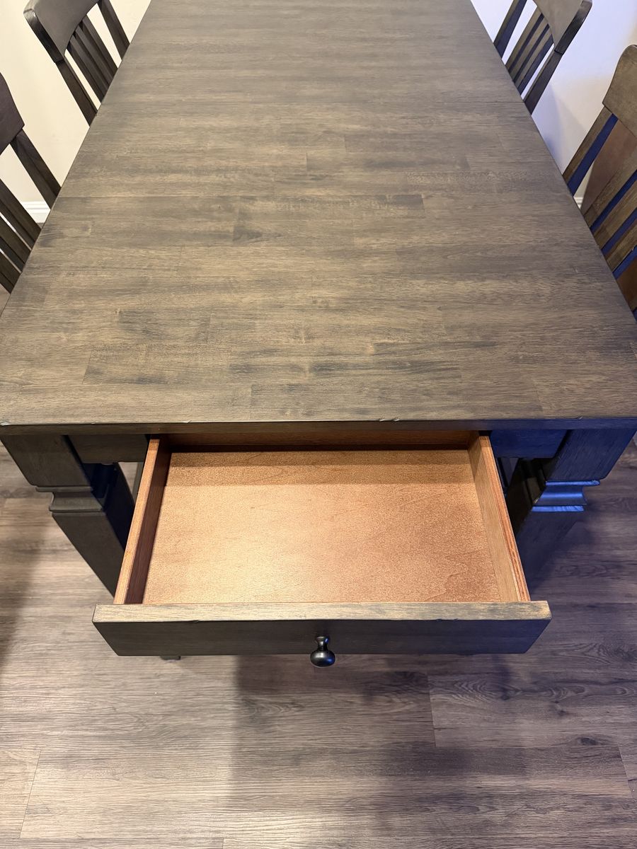 VenmoSolid wood dining table with leaf and four chairs. Stain is a grayish-brown color. Has a small drawer on each end. Excellent condition and barely used with no scratches, water marks, discoloring, dents, etc. Dimensions: