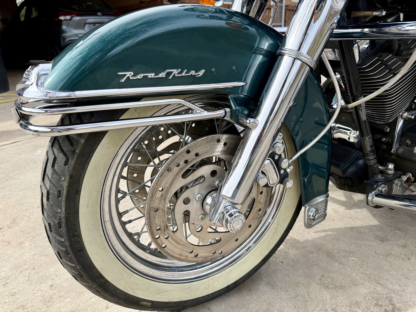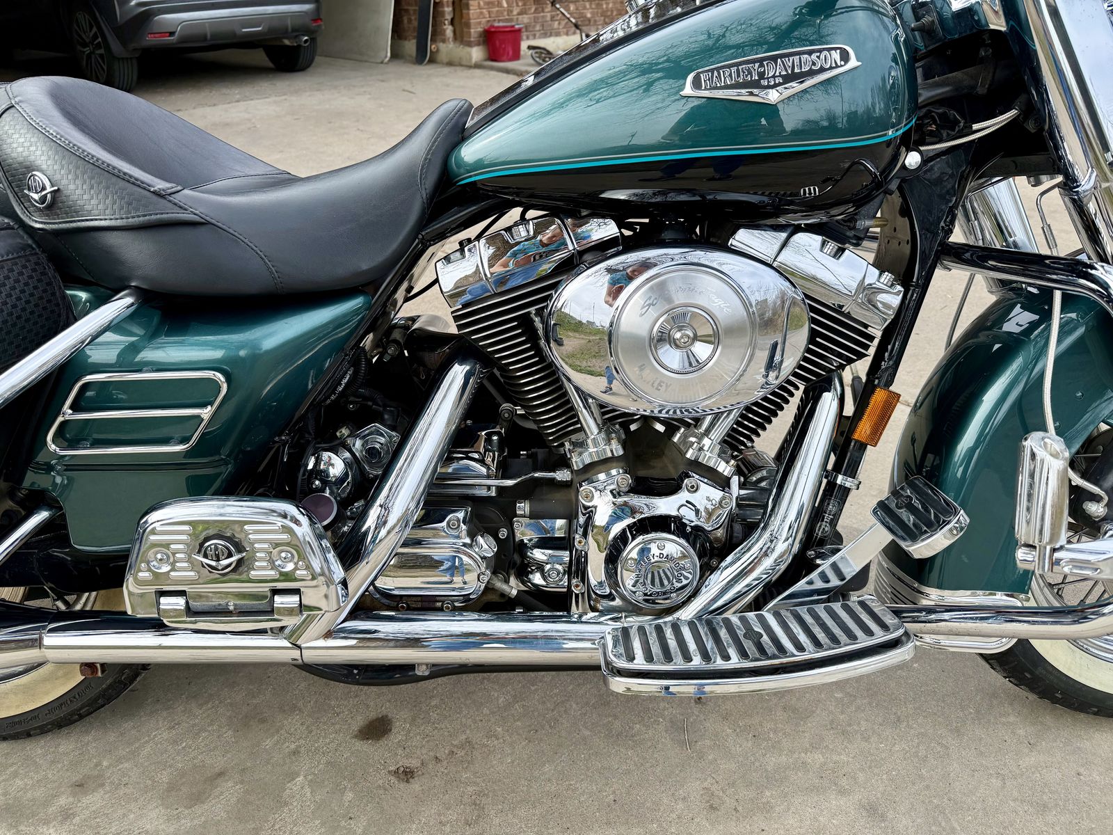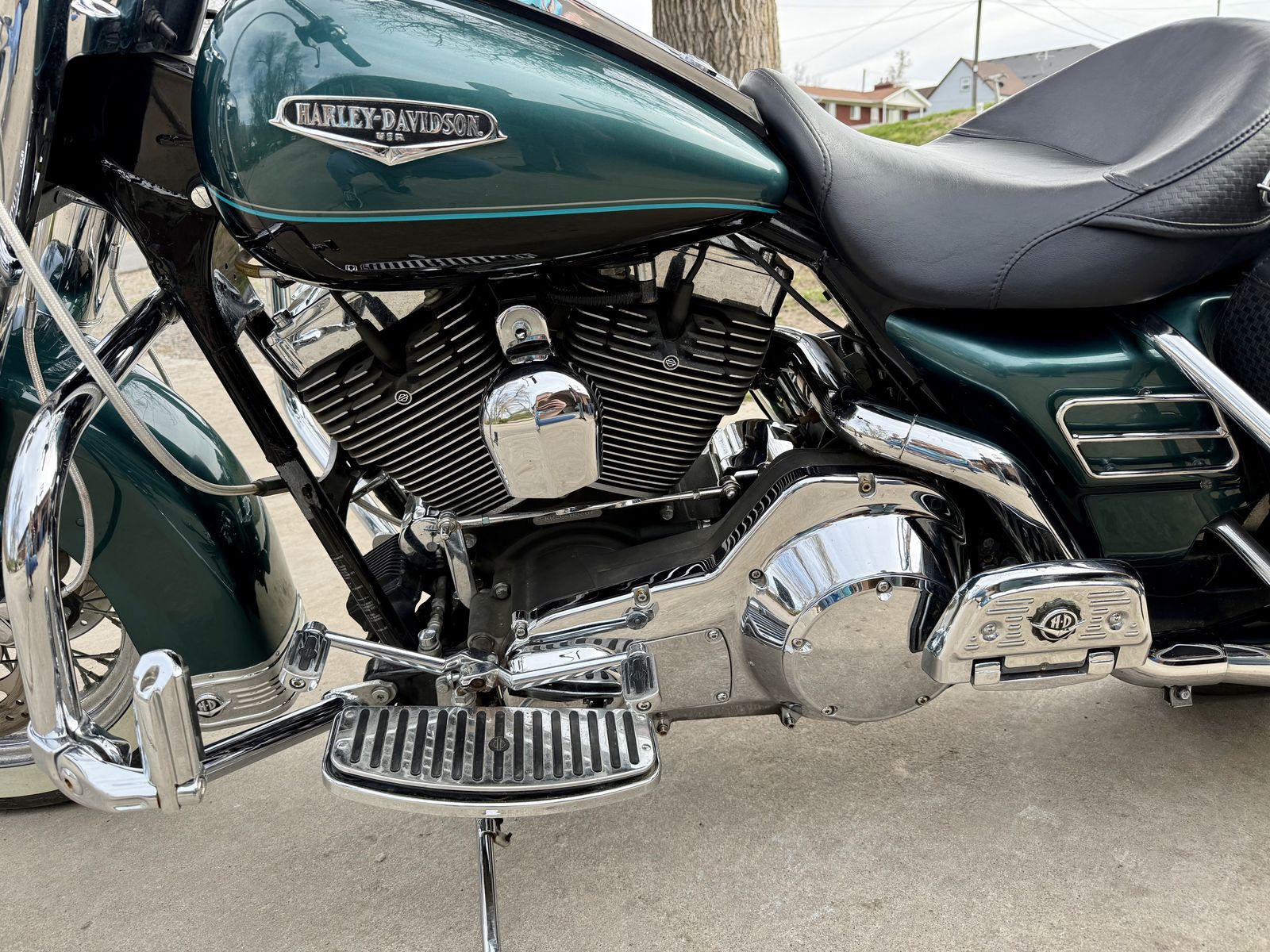 This is a well-kept touring bike with classic styling, deep green paint, and lots of chrome. Great for cruising or longer trips.