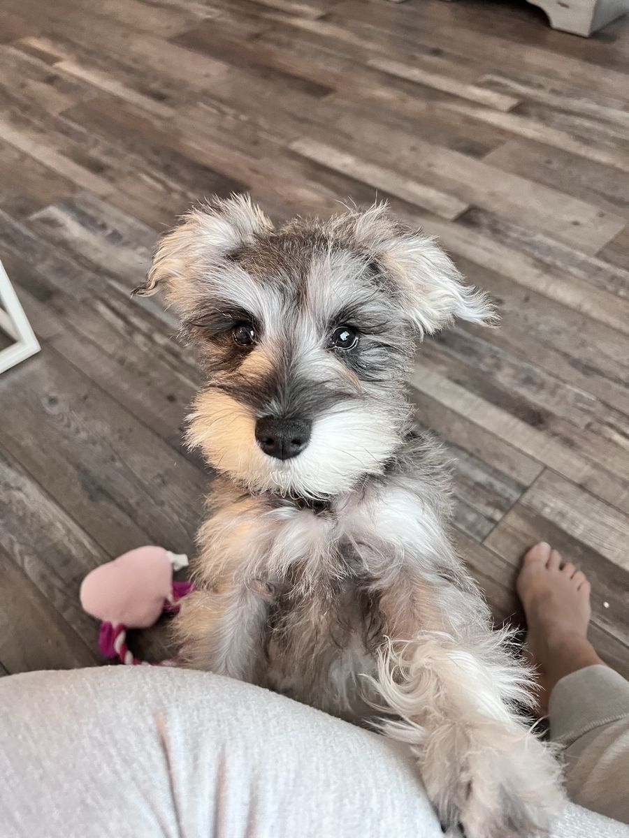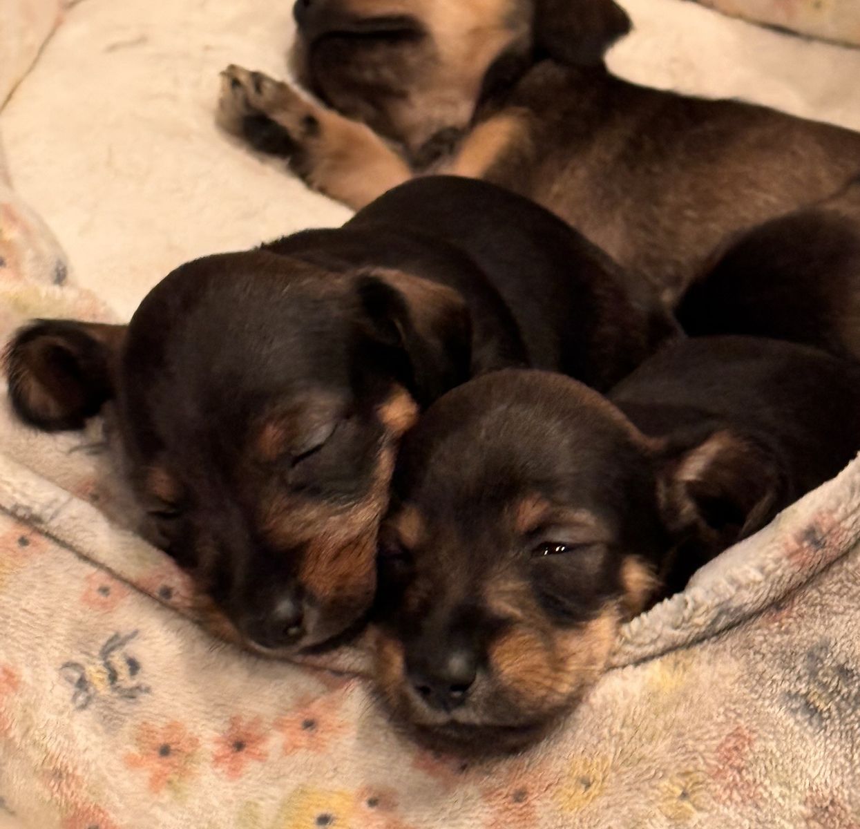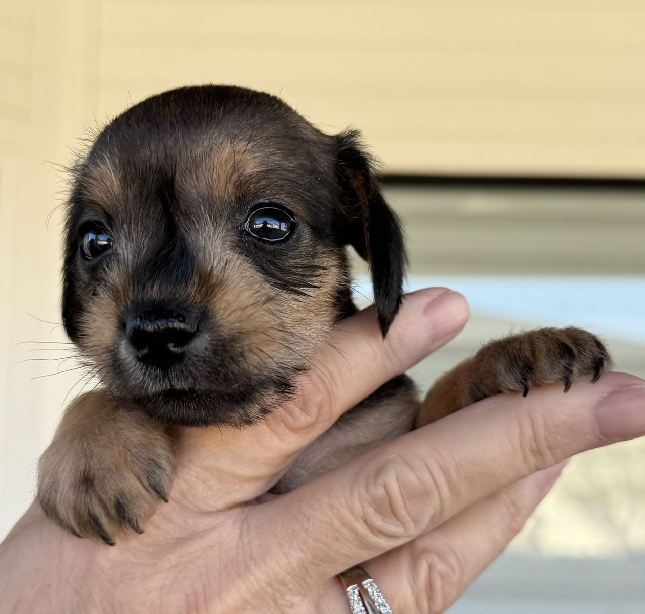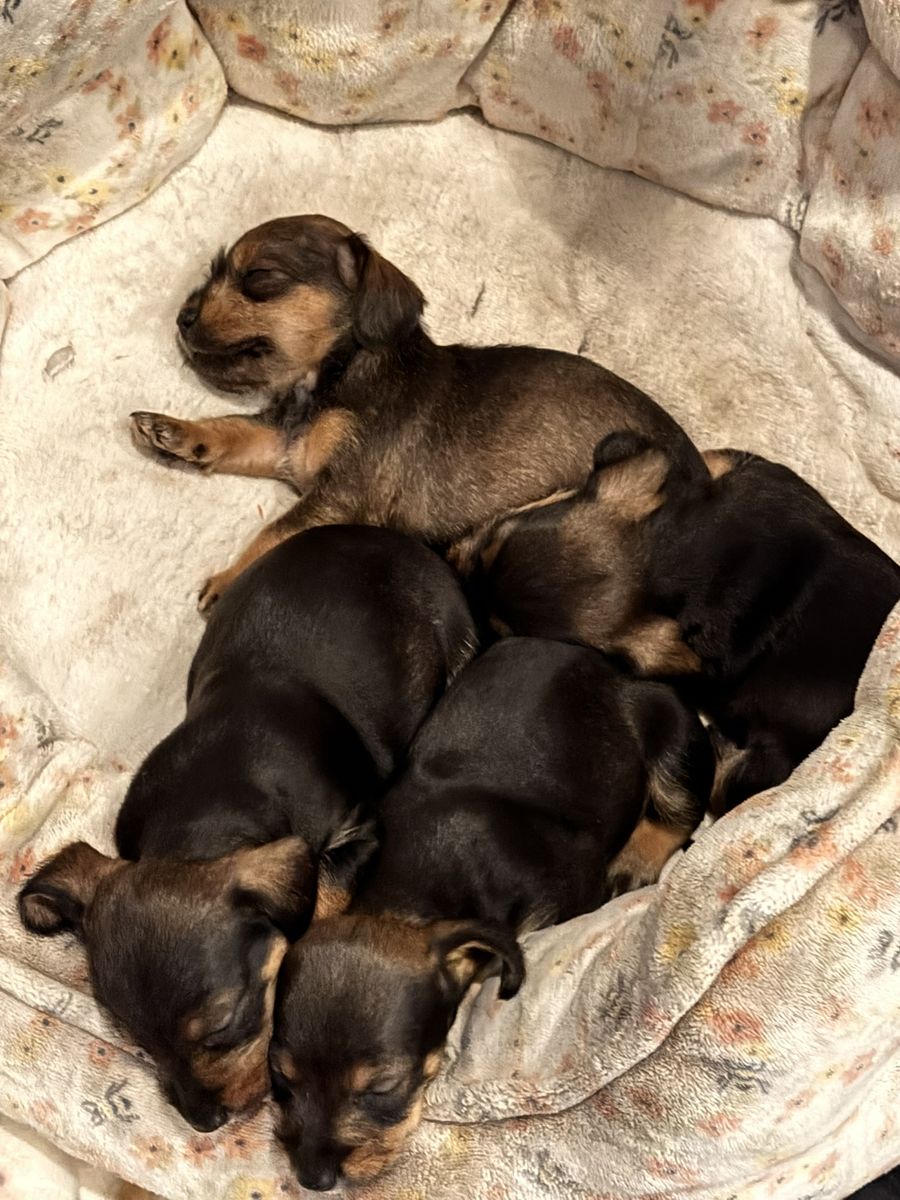 ZelleBeautiful Schnoxie puppies available from a rare breeding. Schnoxies are a unique cross between a Miniature Dachshund and Miniature Schnauzer, known for their charm, intelligence, and loyal companionship.