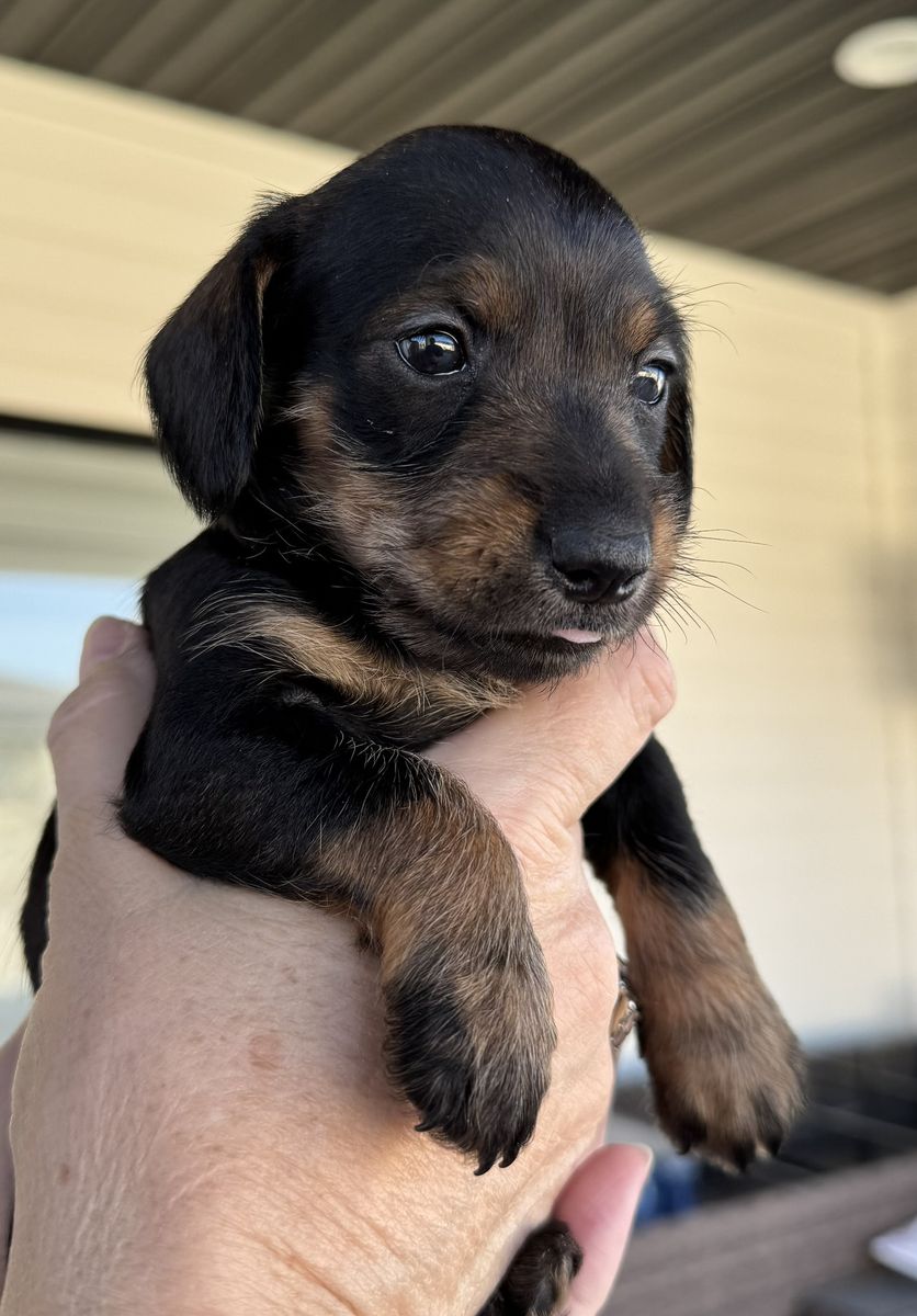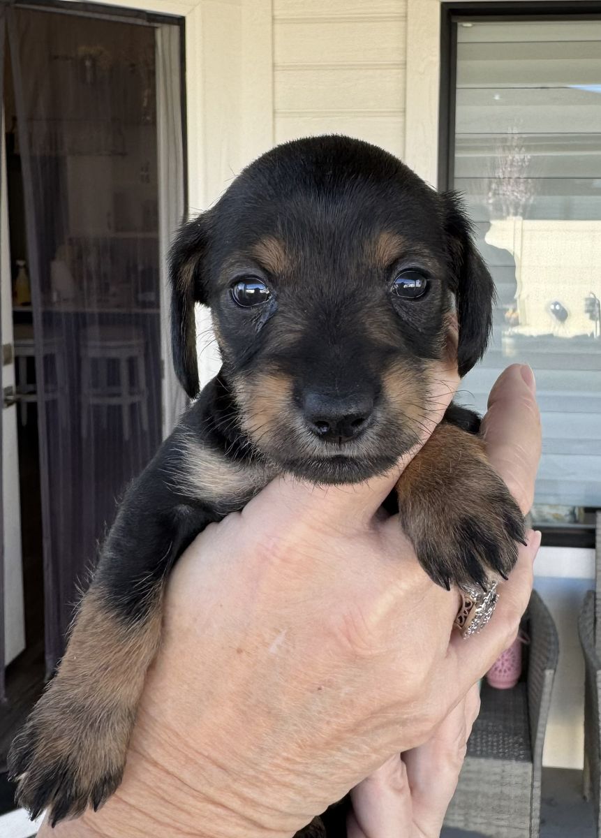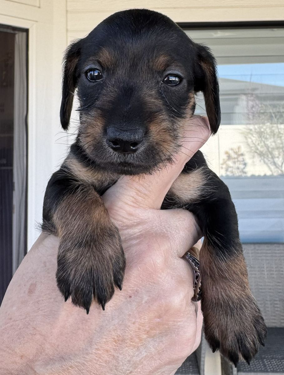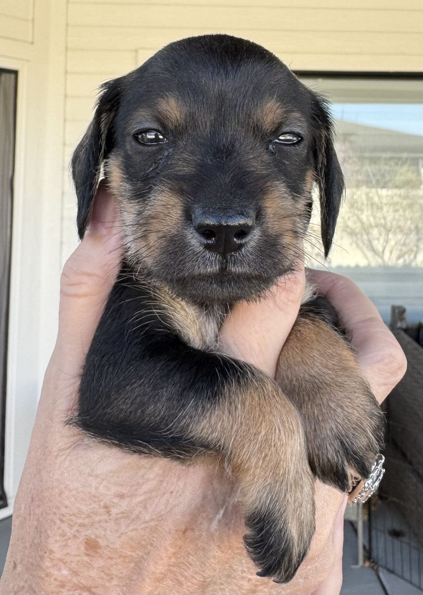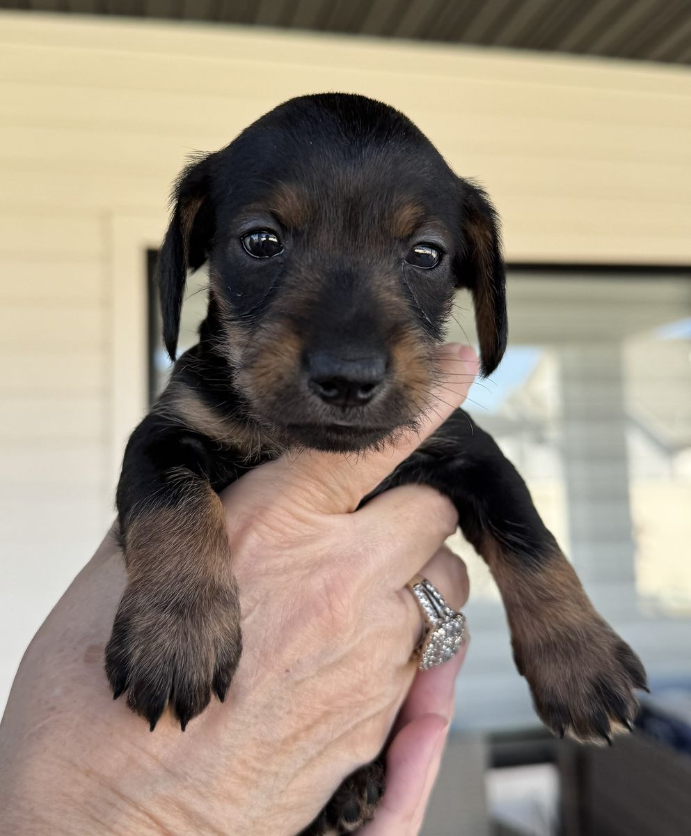ZelleBeautiful Schnoxie puppies available from a rare breeding. Schnoxies are a unique cross between a Miniature Dachshund and Miniature Schnauzer, known for their charm, intelligence, and loyal companionship.