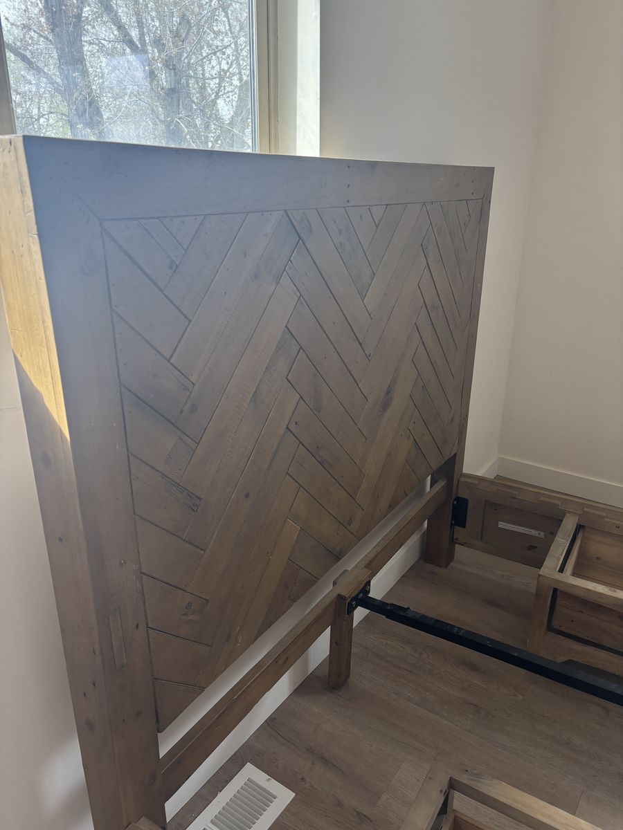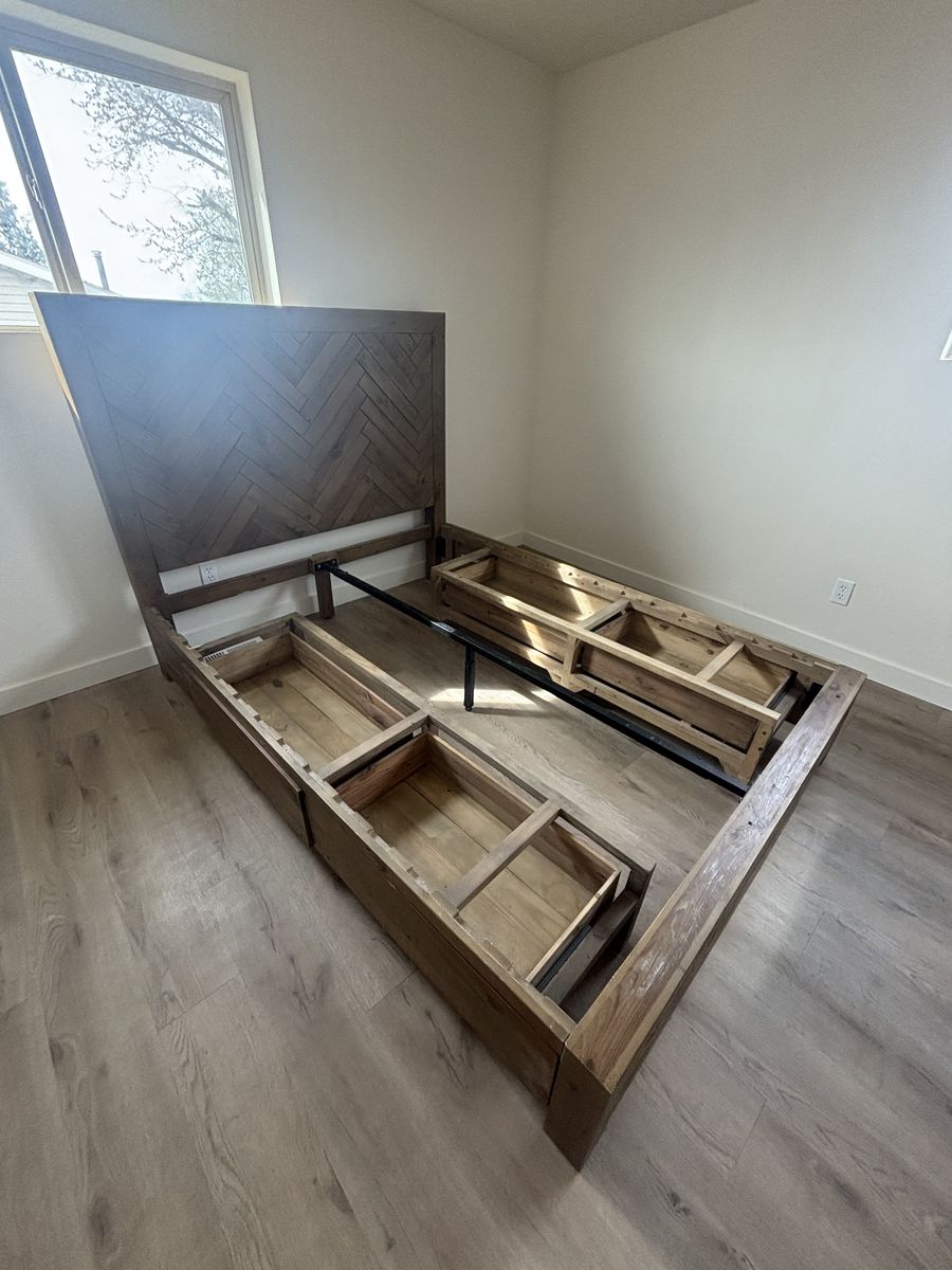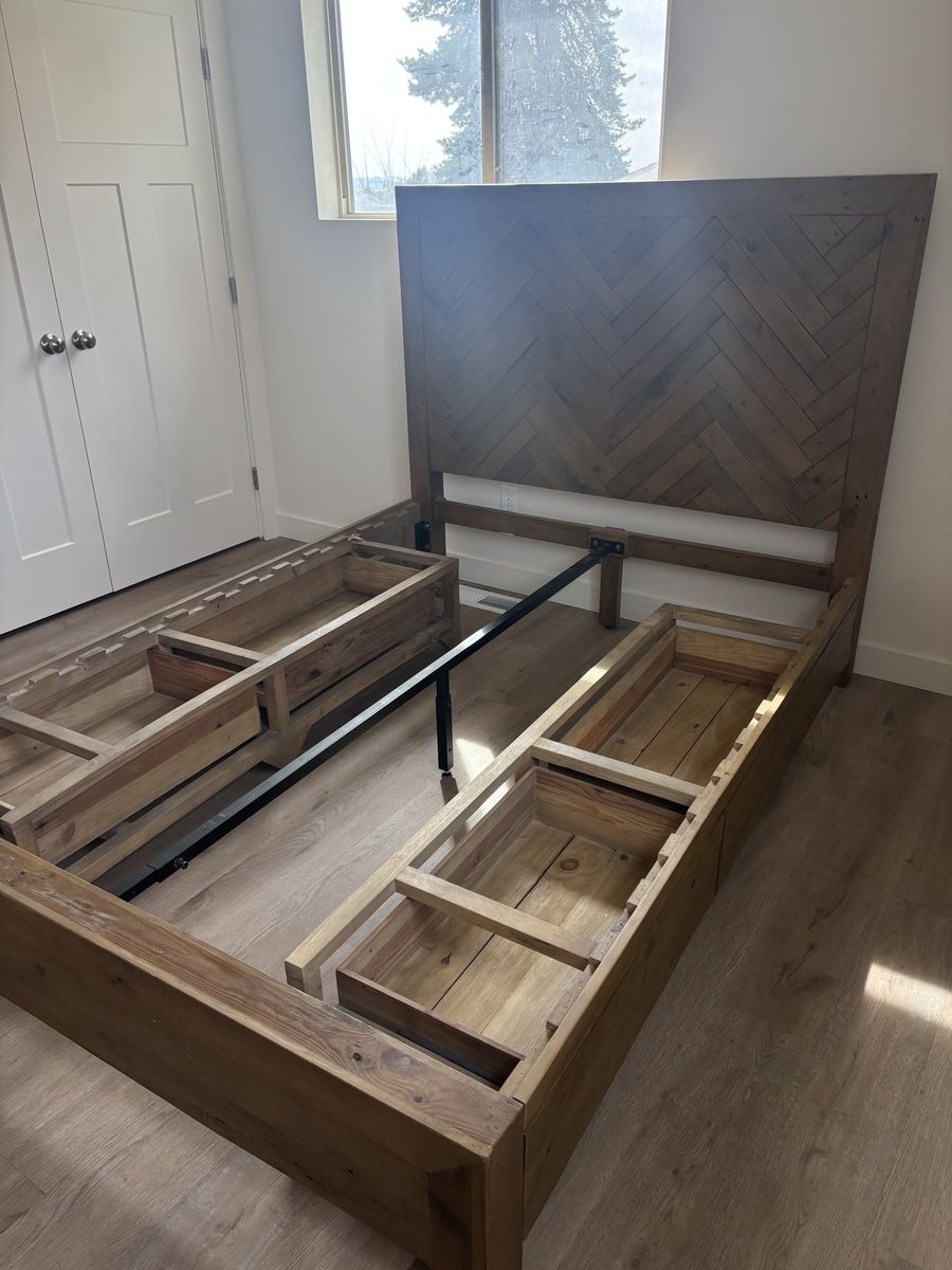 VenmoKing (or queen) size wooden platform bed frame with a chevron-pattern headboard and built-in storage drawers underneath. Easy to reassemble!