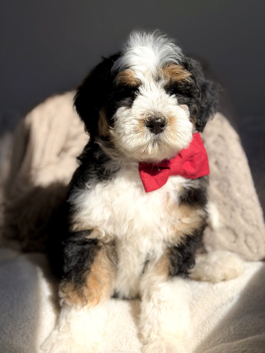 Details: • Mini size (estimated adult weight: 30 lbs) • Stunning black tri coloring (black, white & copper) • Soft, wavy/low-shedding coats • Raised with love in our home • Well-socialized with kids and everyday household life