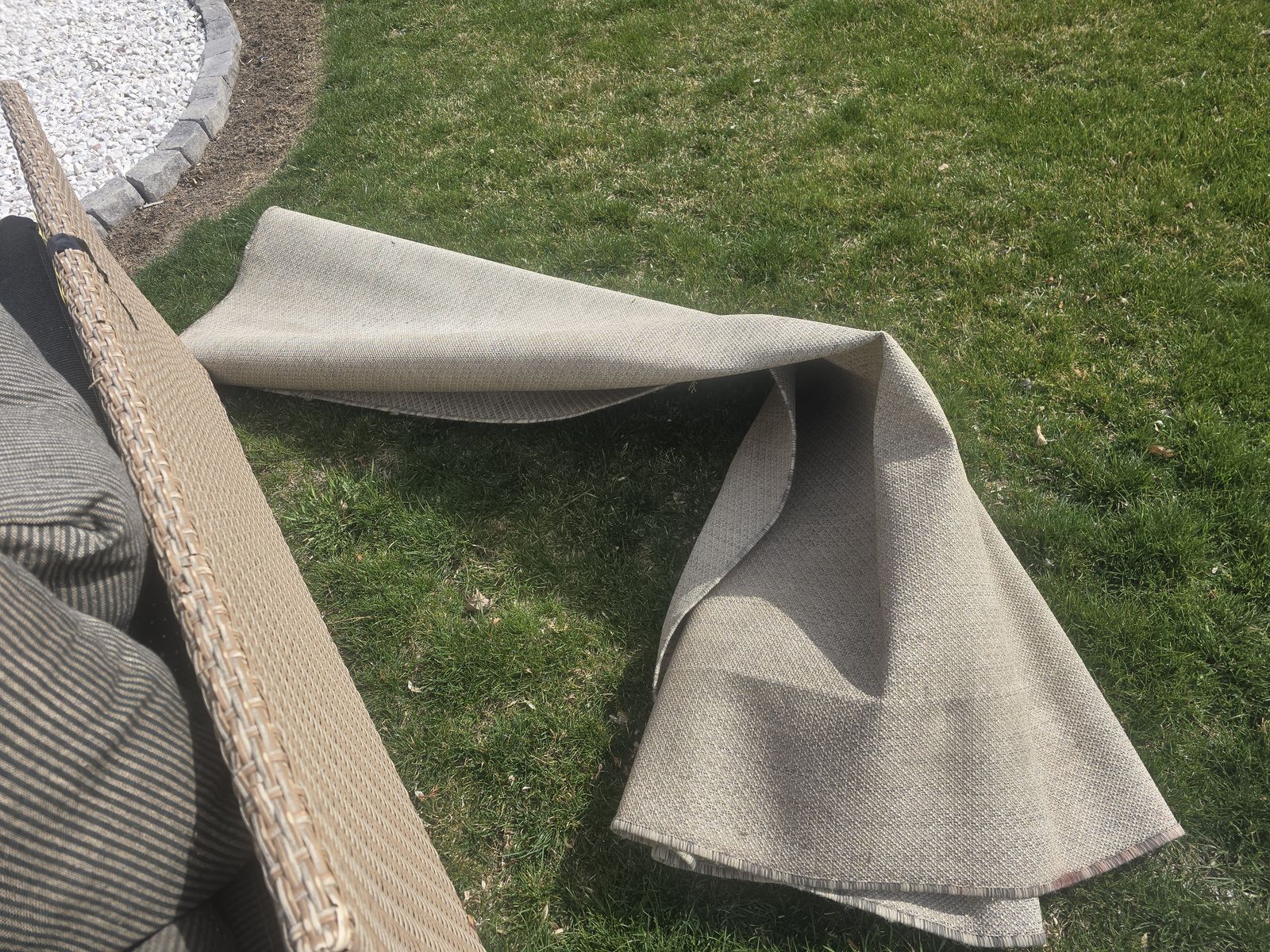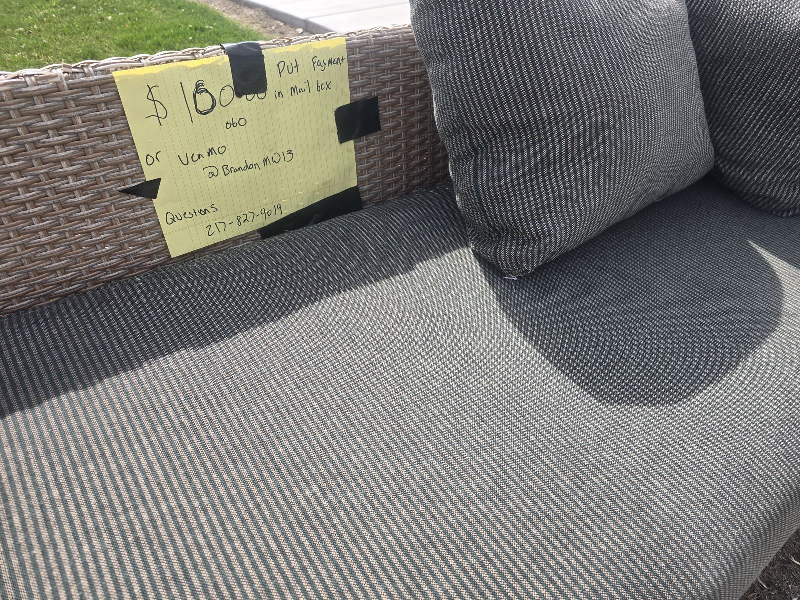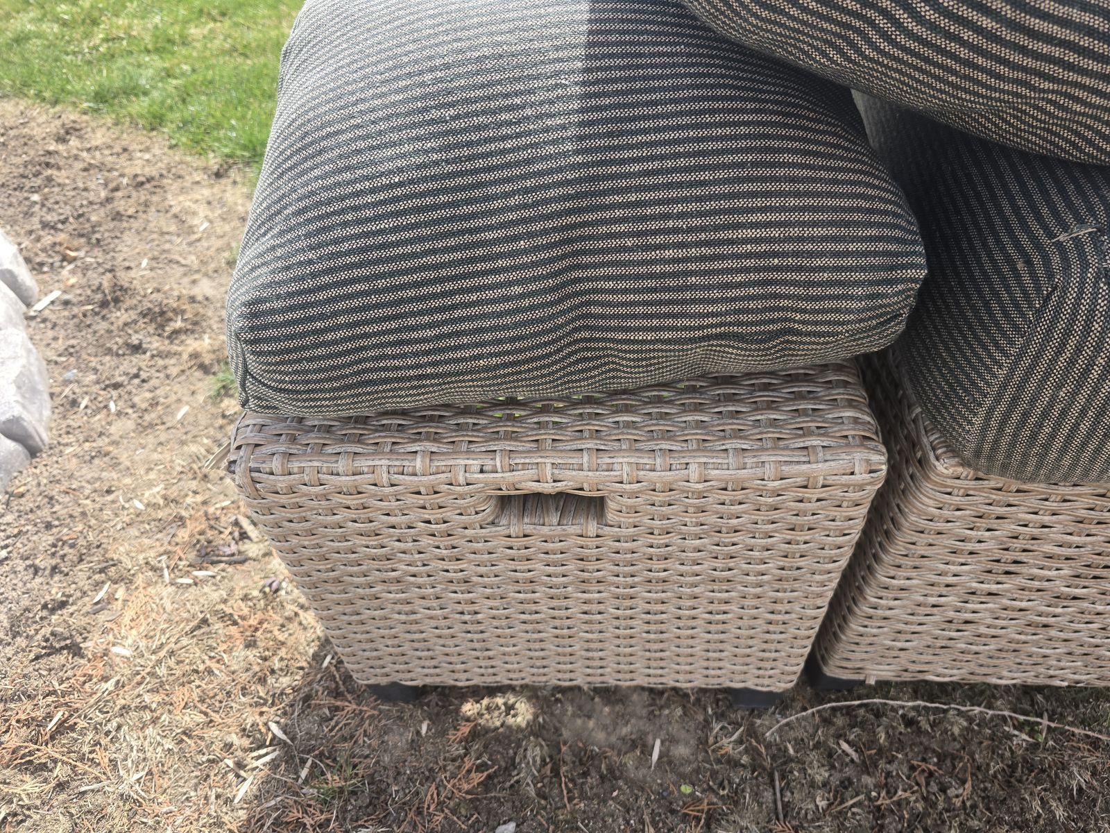 Lightly used outdoor furniture set i. Built sturdy and holds up well outside. Very comfortable seating, includes a matching leg rest for added relaxation. Comes with an outdoor rug that ties the whole setup together. Ideal for patio, balcony, or backyard. the side arm is torn. OBO
