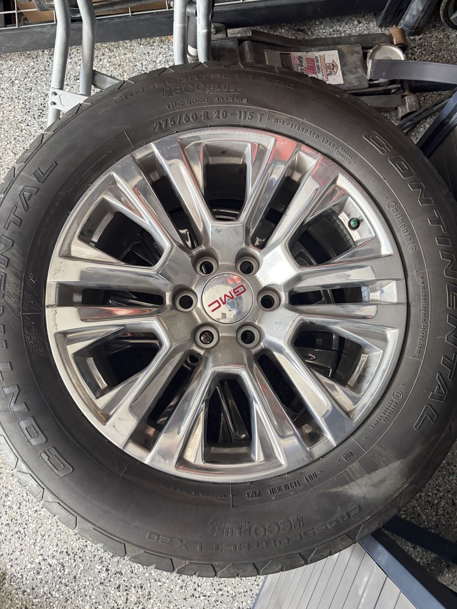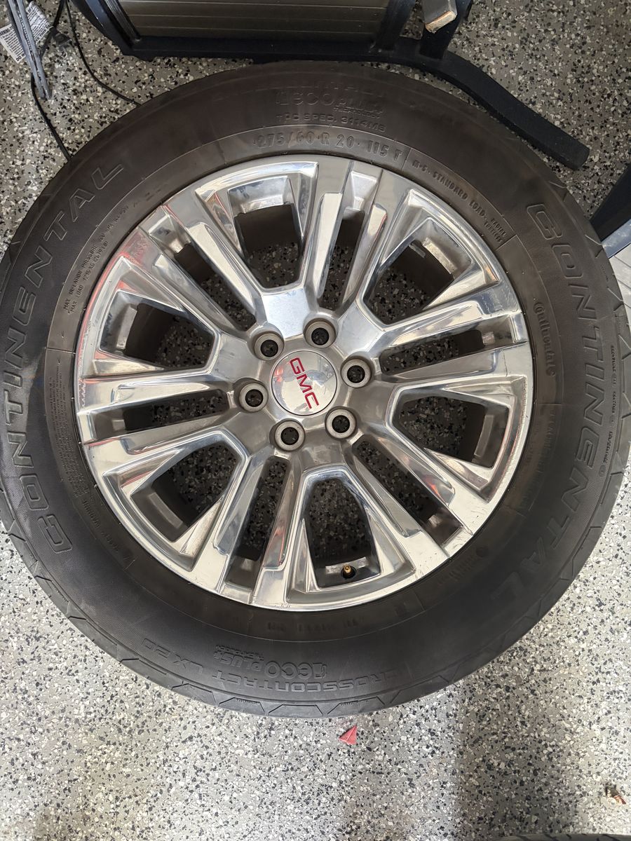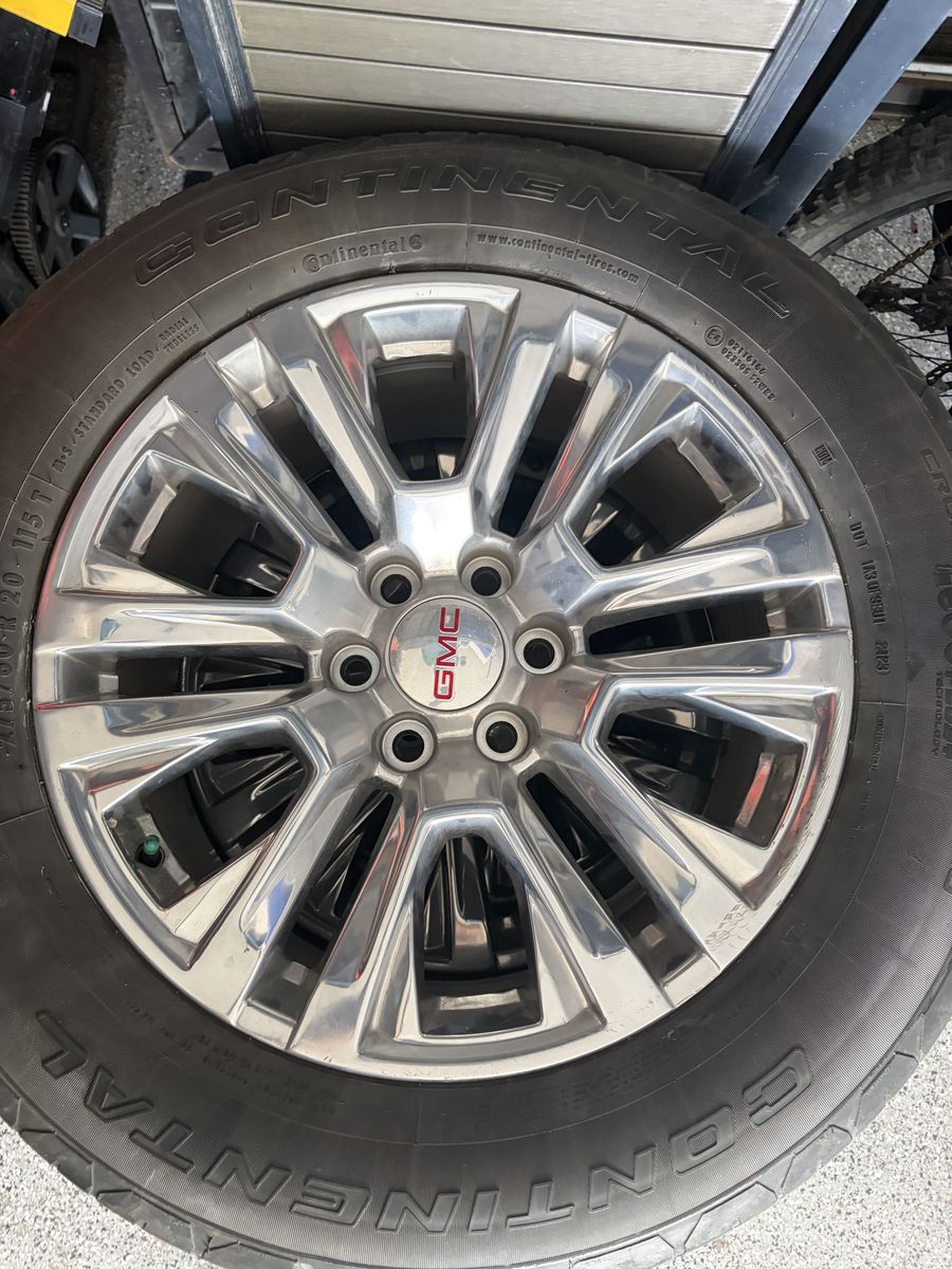 ApplePay20 Inch Wheels and Tires. These are from a 2023 Yukon Denali. The wheels are in great condition. The tires are at the end of their tread.