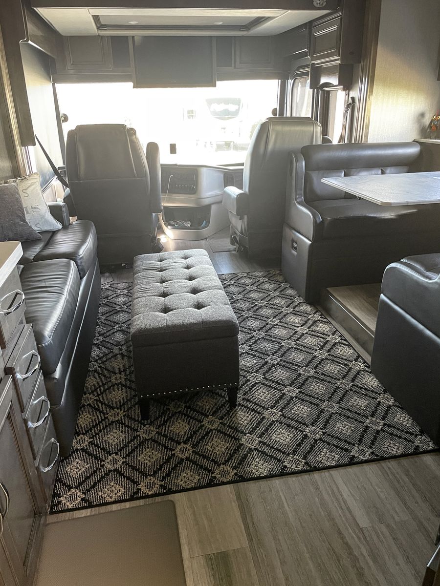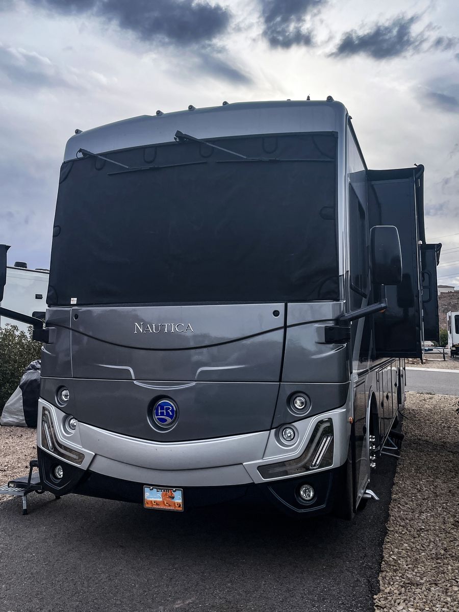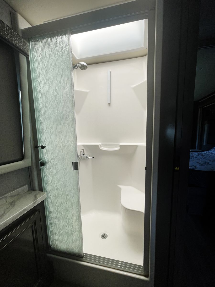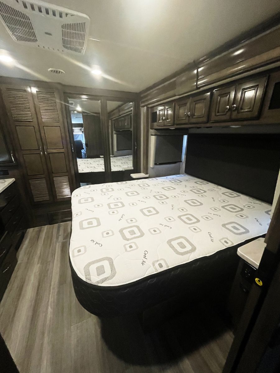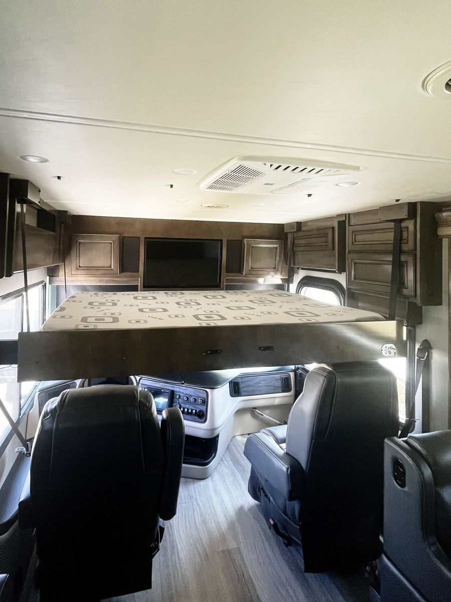 Driving is a pleasure thanks to the smooth, powerful 340HP diesel engine and an expansive windshield that provides an incredible view of the journey ahead. Outside, you'll find a large power awning for shade and ample storage for all your travel essentials.