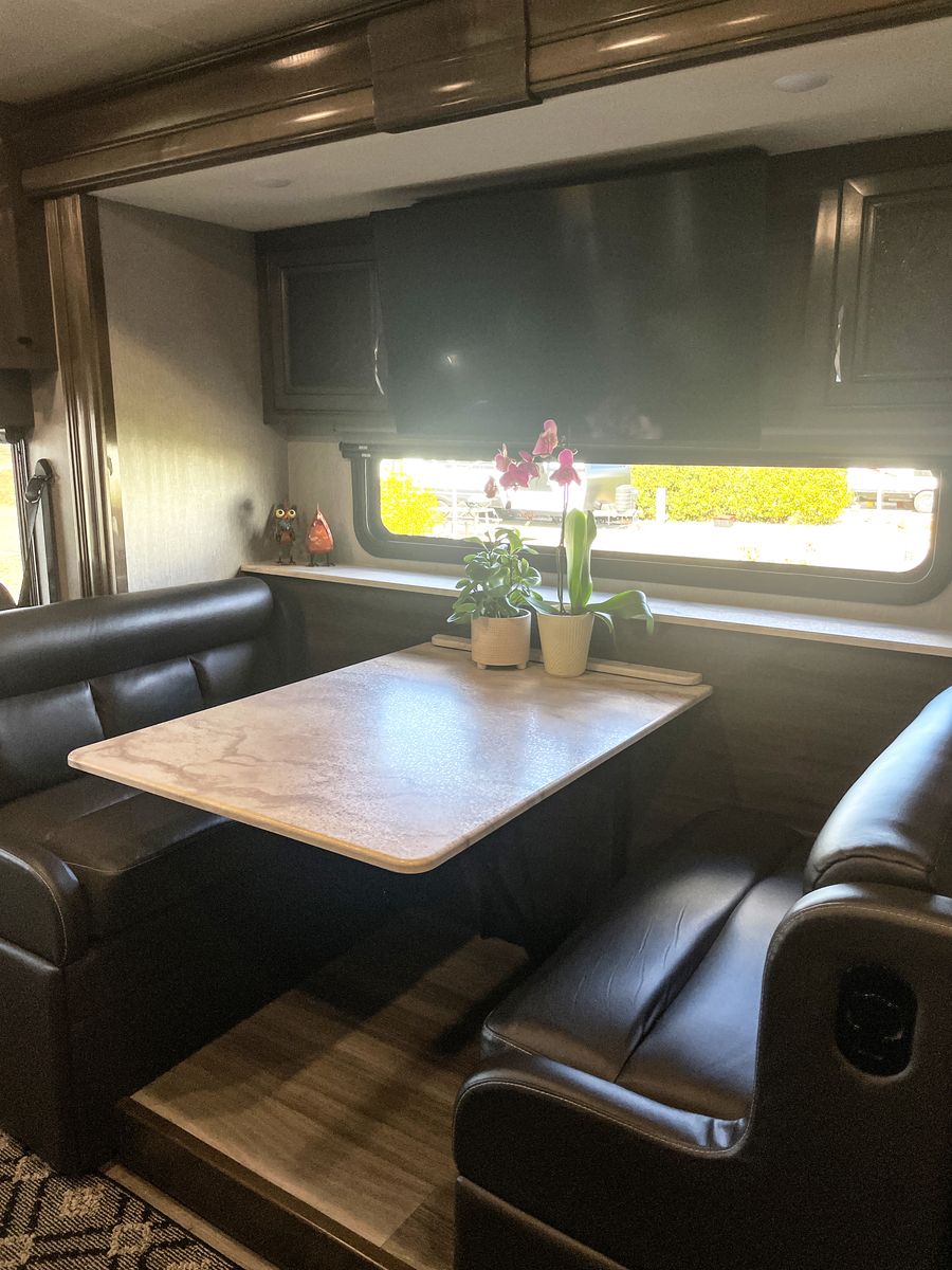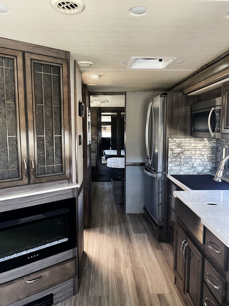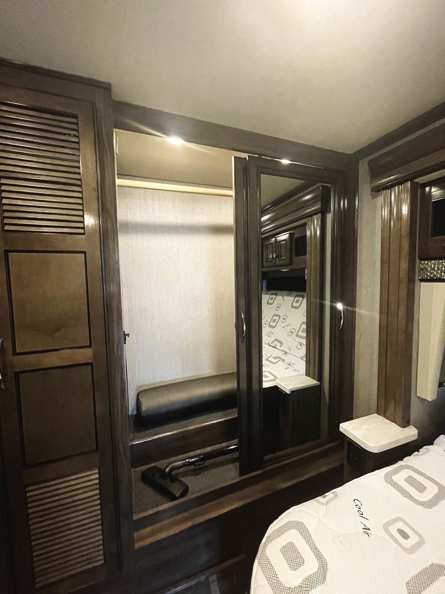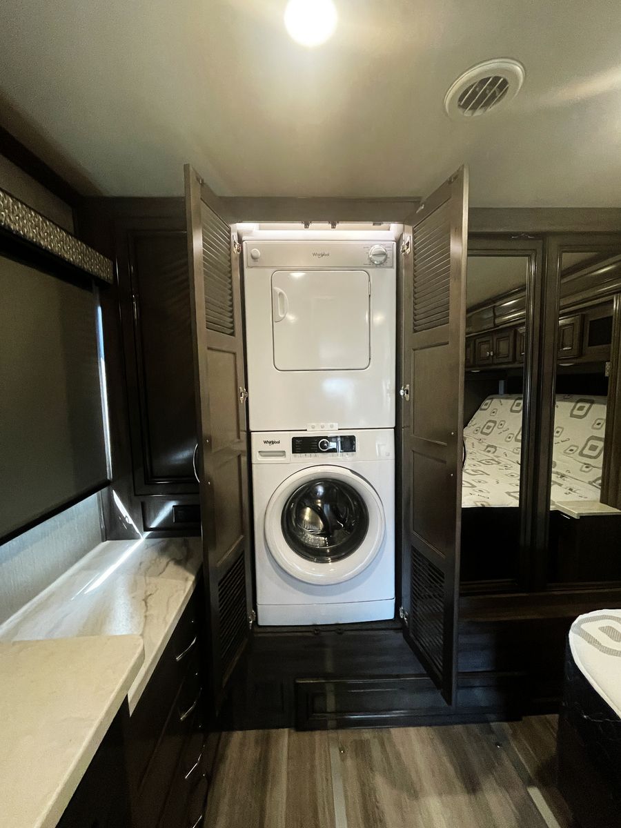 Driving is a pleasure thanks to the smooth, powerful 340HP diesel engine and an expansive windshield that provides an incredible view of the journey ahead. Outside, you'll find a large power awning for shade and ample storage for all your travel essentials.