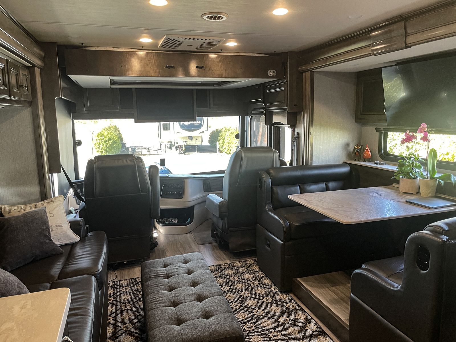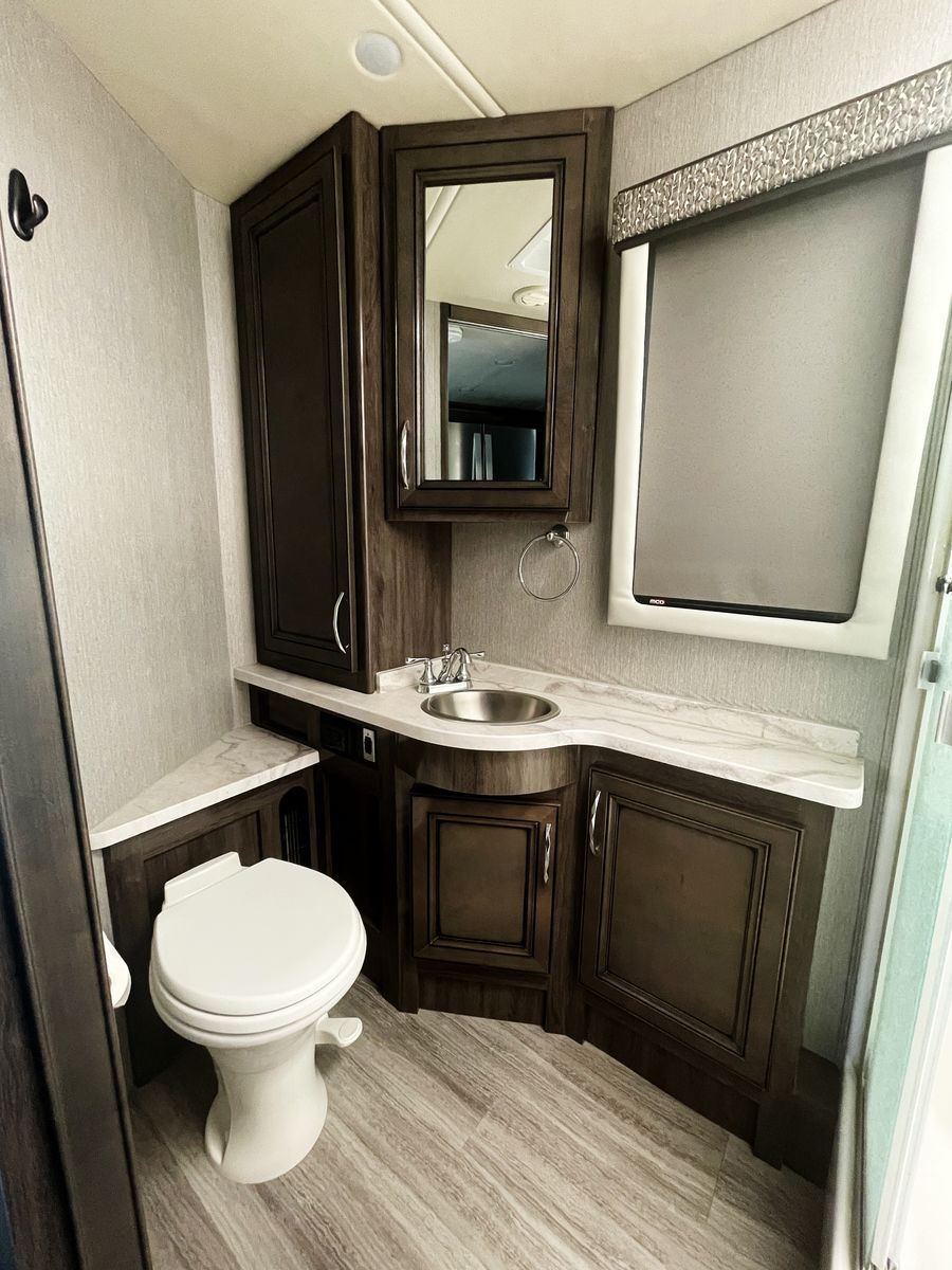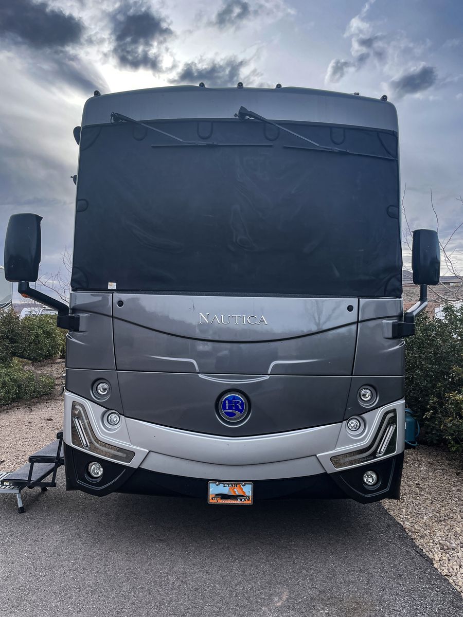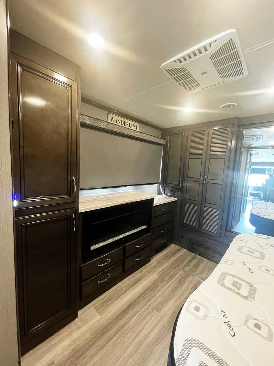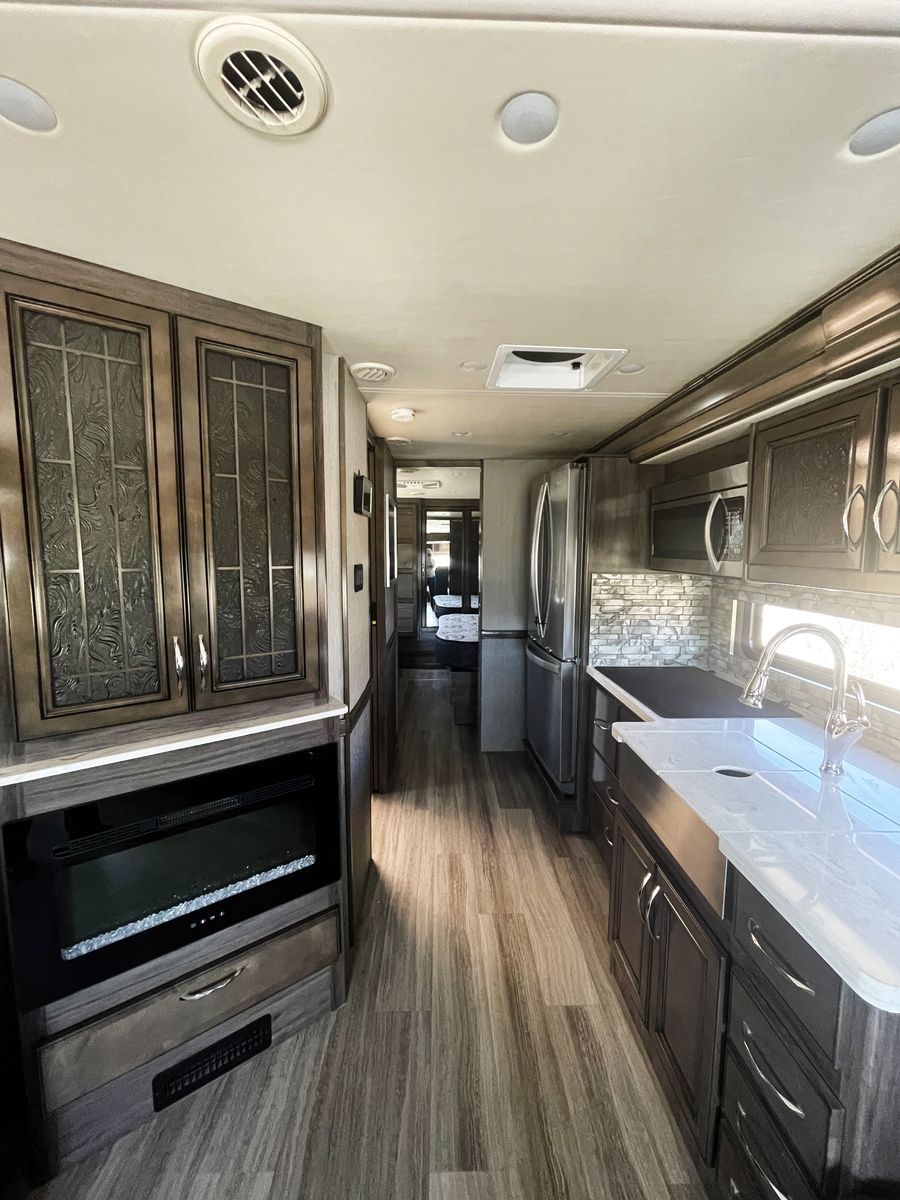 Driving is a pleasure thanks to the smooth, powerful 340HP diesel engine and an expansive windshield that provides an incredible view of the journey ahead. Outside, you'll find a large power awning for shade and ample storage for all your travel essentials.
