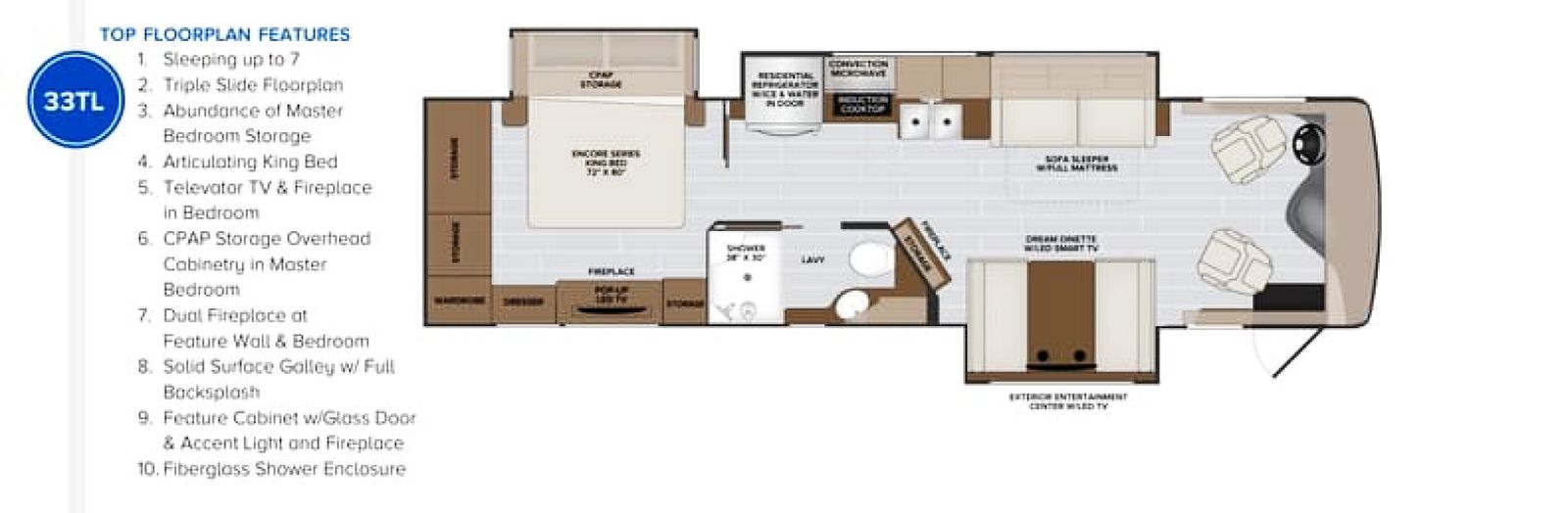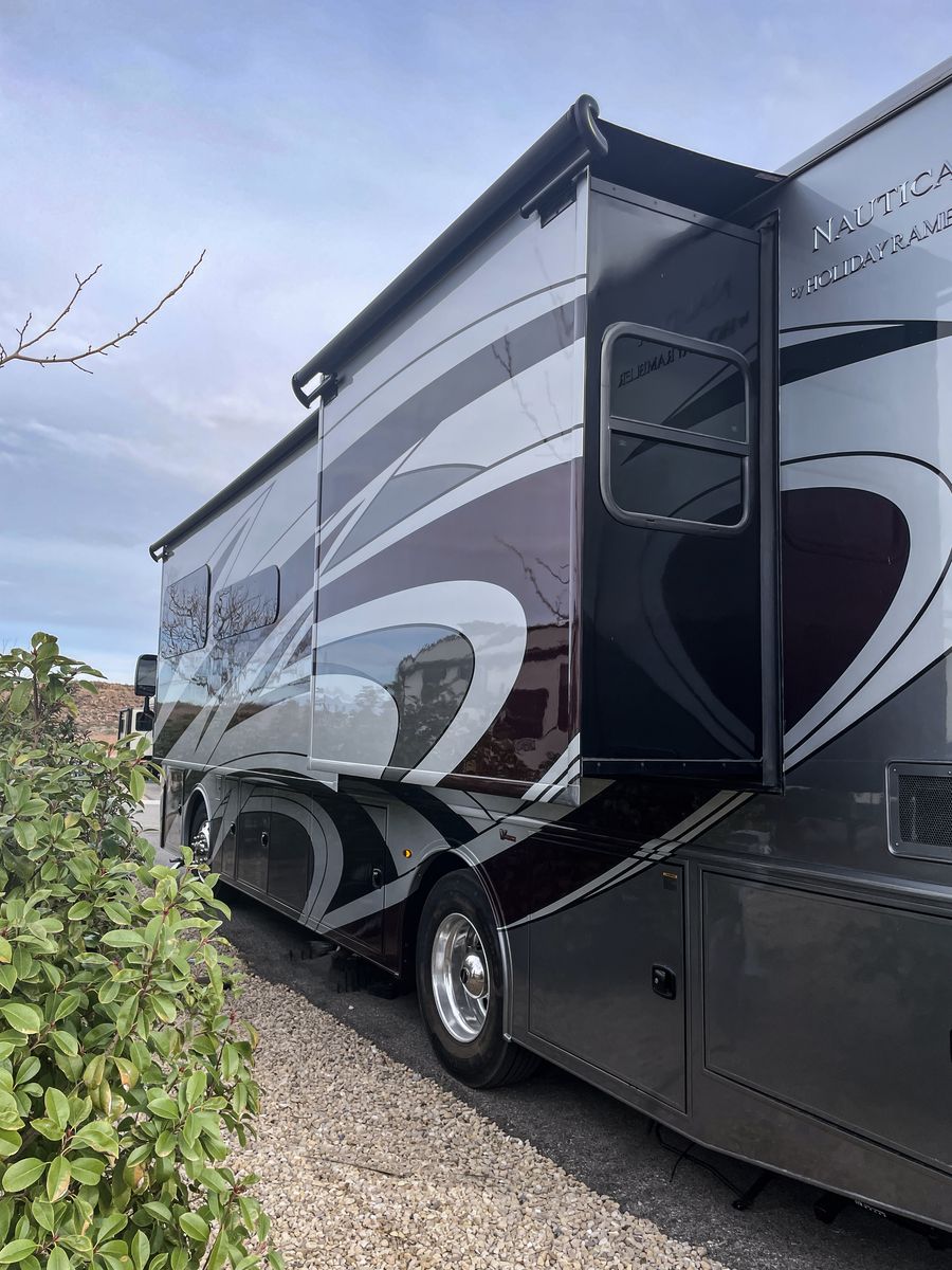 Holiday Rambler is renowned for quality, and the Nautica 33TL certainly delivers. The layout is thoughtfully designed for both comfort and space, featuring a private master suite with a king-sized bed, a drop-down bed over the cab, and three slide-outs to maximize your living area.