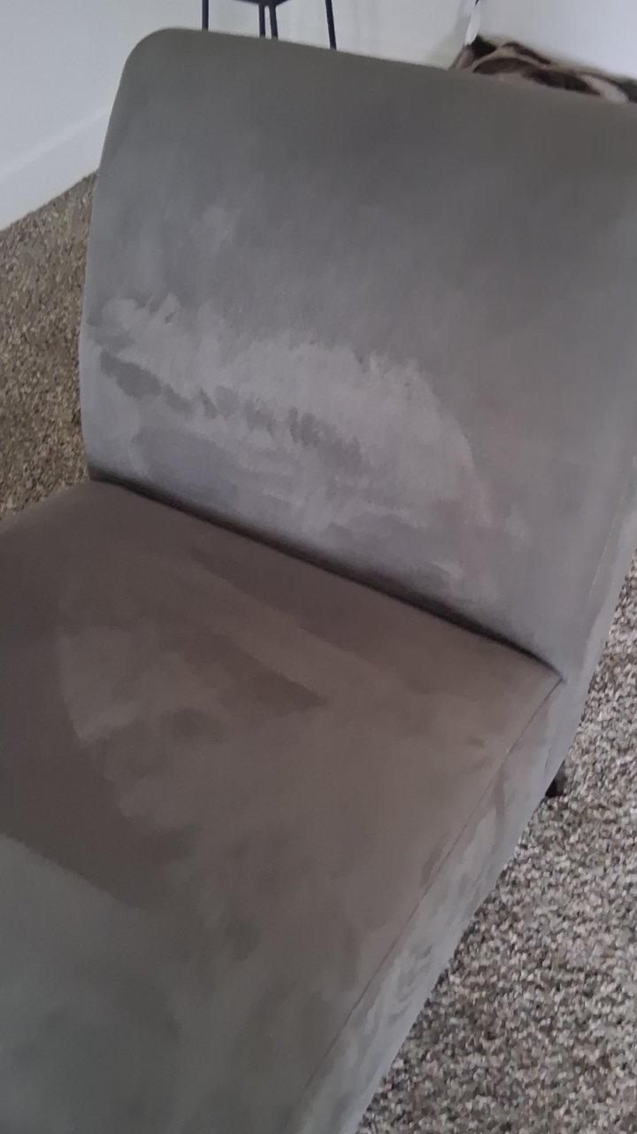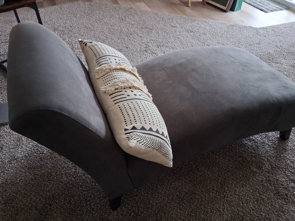 VenmoGray chaise will fit most decor. Pet-free, smoke-free home. Fabric is a soft velveteen fabric. 55" long x 26" wide x 33" high.