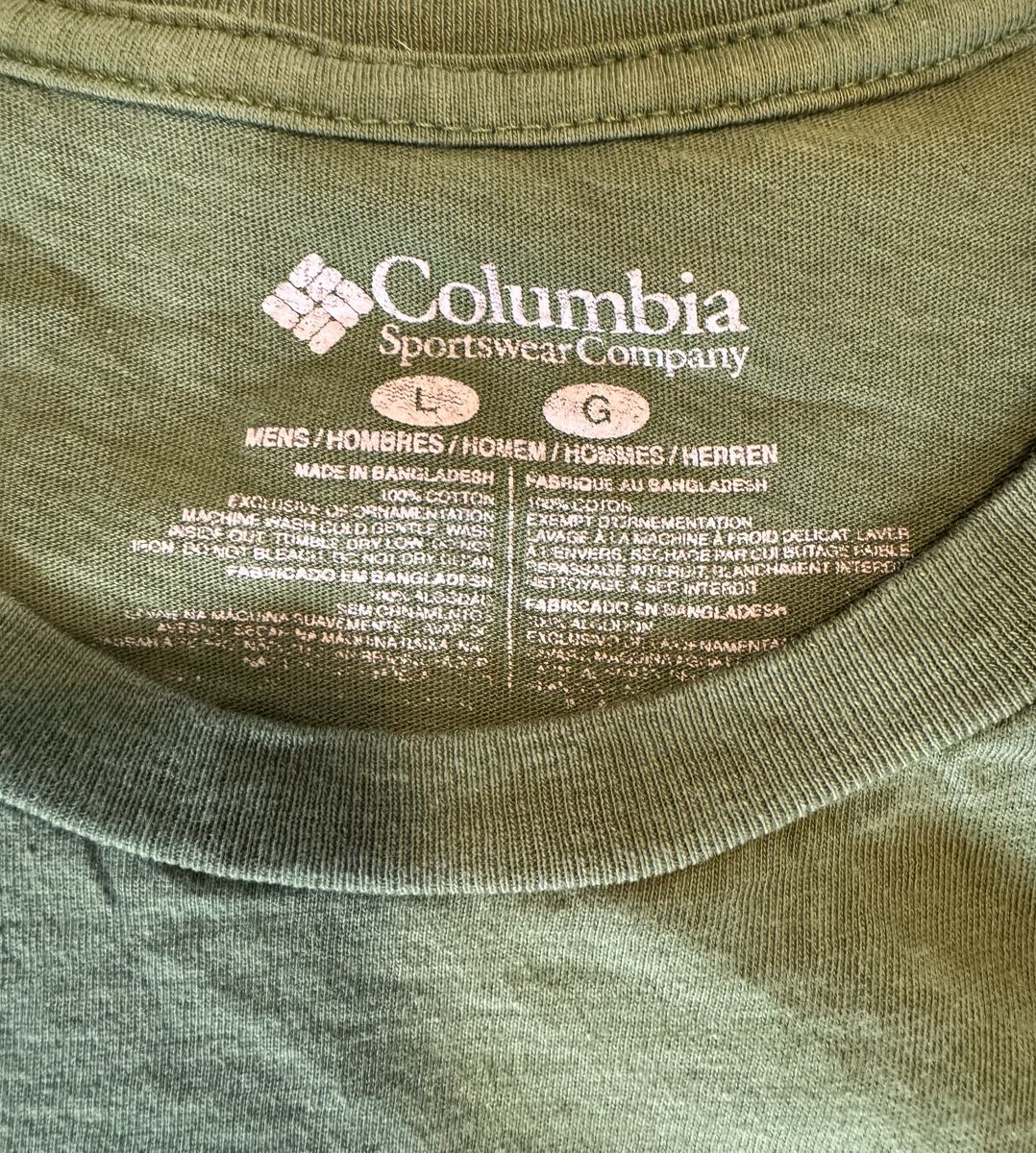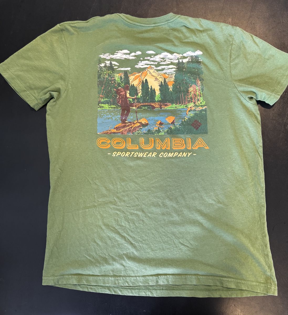 VenmoCool Columbia t-shirt for men. Size Large. Has a nice green color. Back has a graphic of a hiker in a mountain and river scene. Small Columbia logo on front chest. Made from 100% cotton.