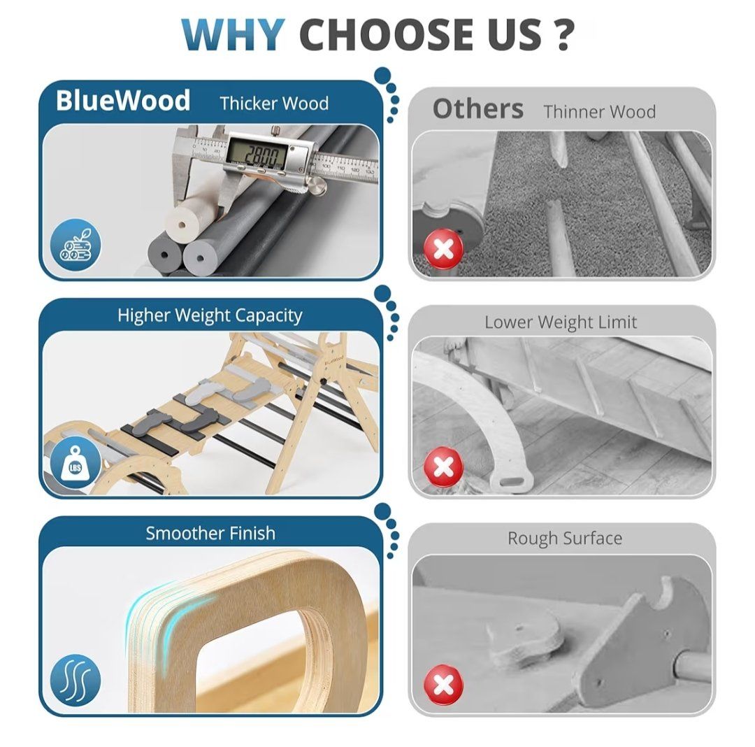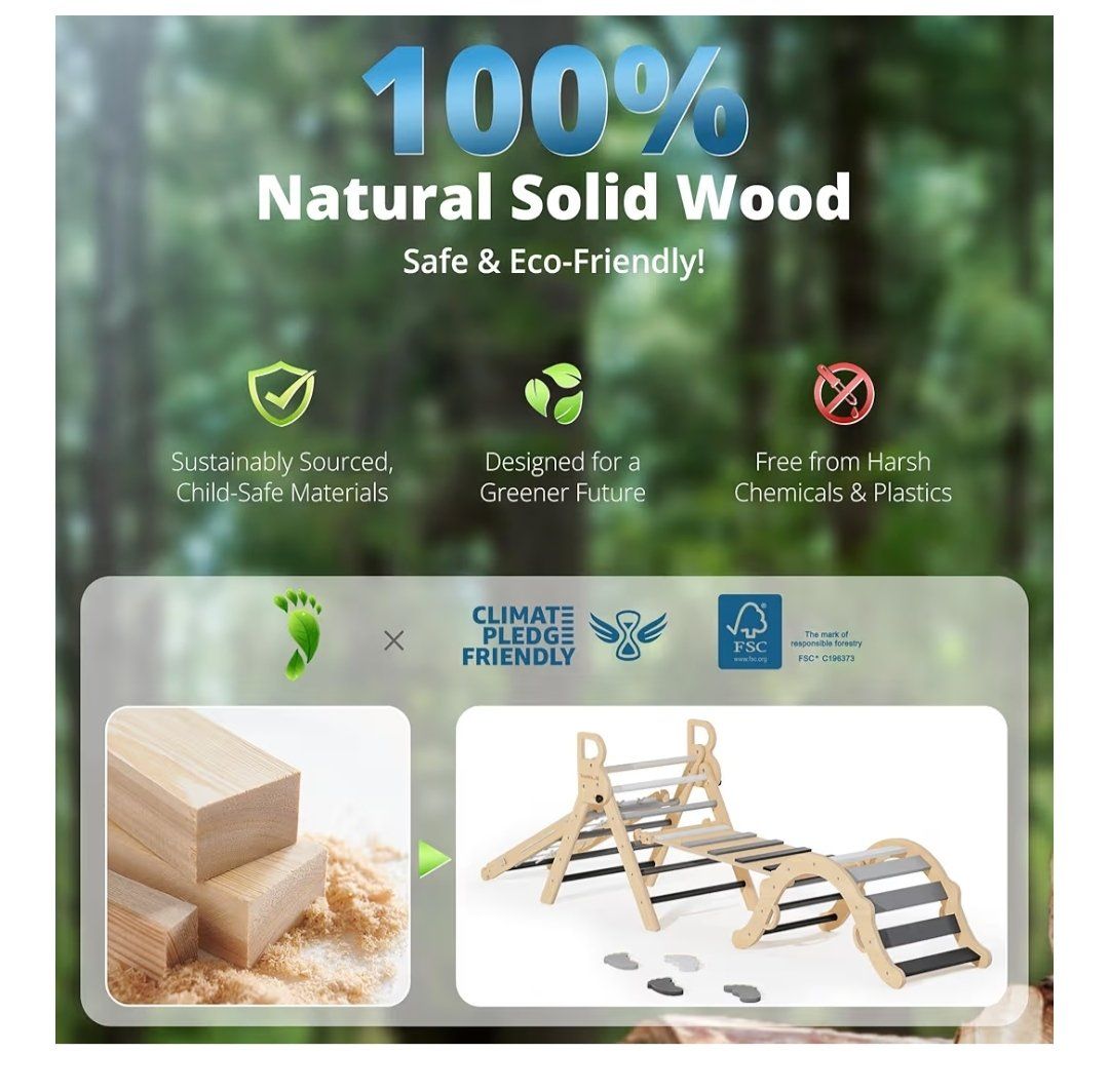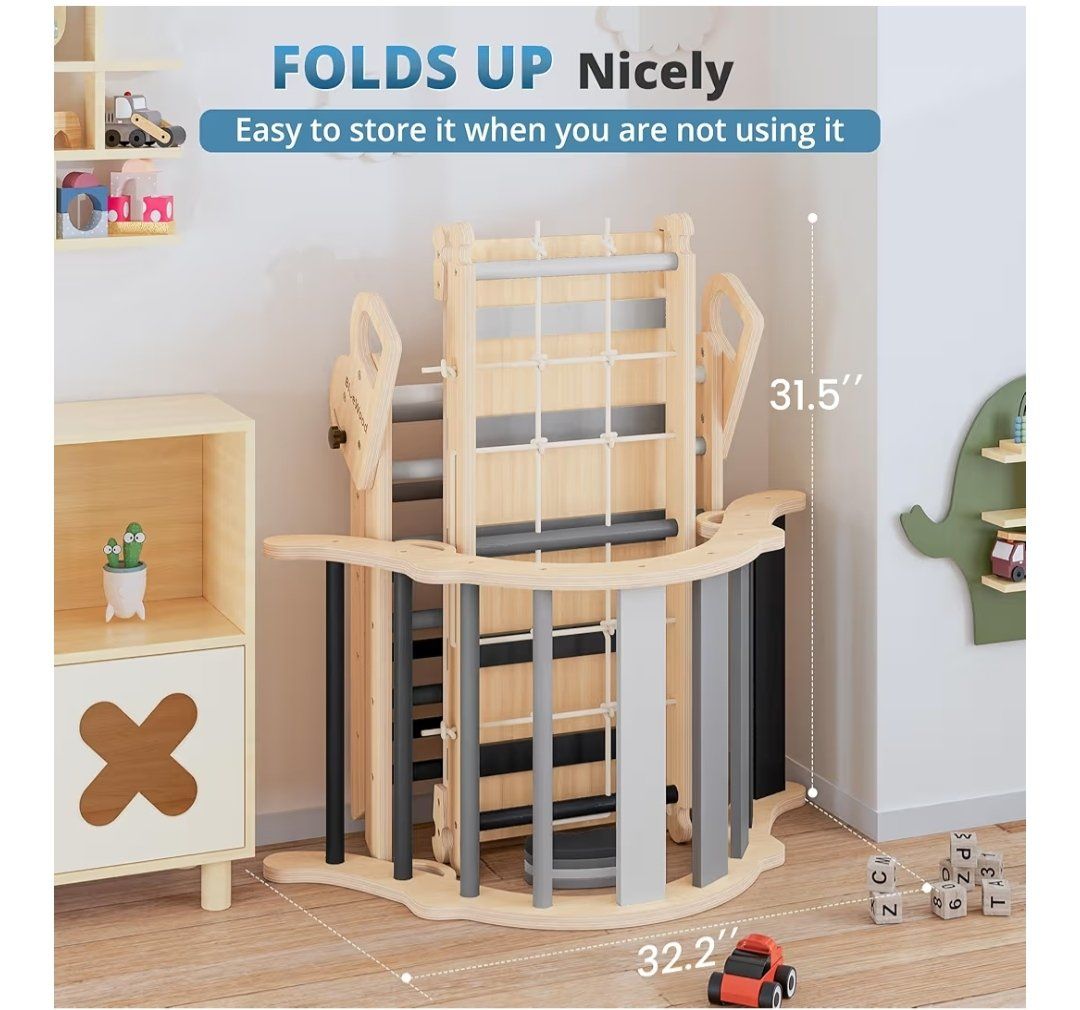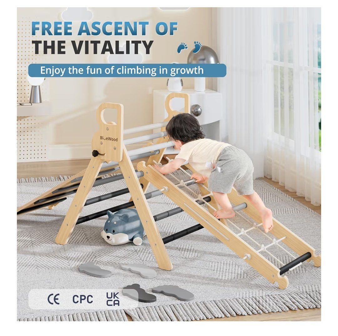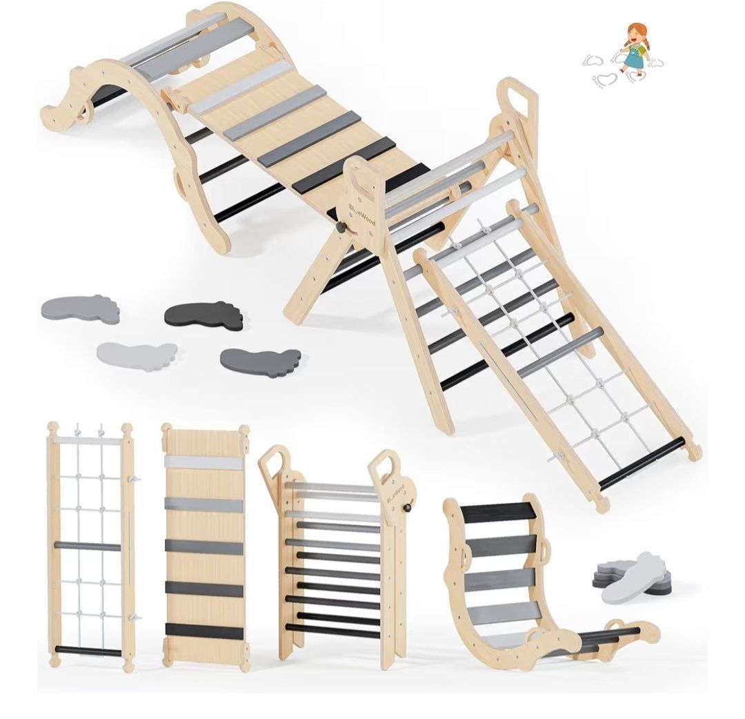 BlueWood 10-in-1 Pikler Triangle Set, Toddler Climbing Toys Indoor, Montessori Climber, Baby Jungle Gyms with Arch, Extra Rope Ladder & Footprint Balance Beam - Grey Twilight. new, cash only