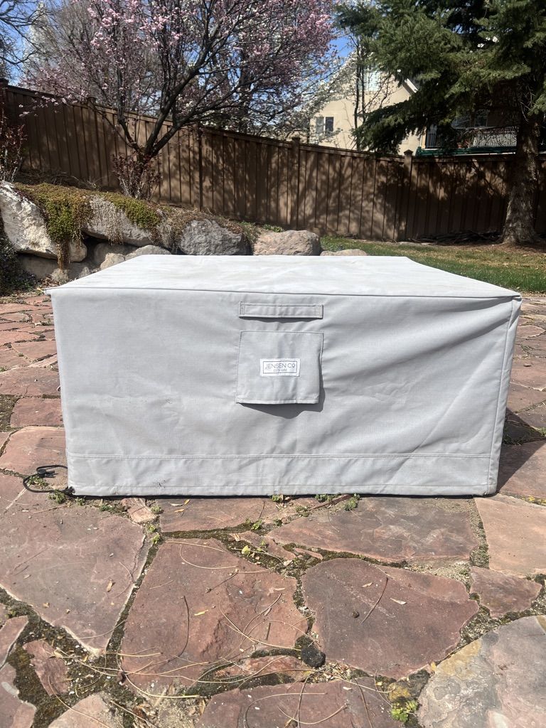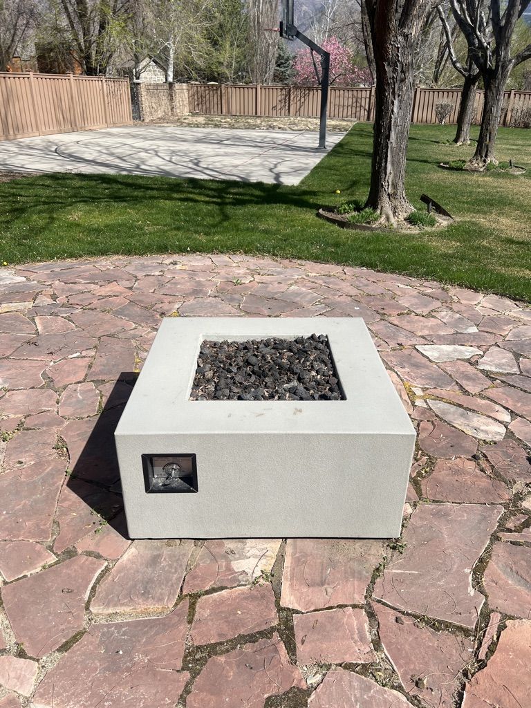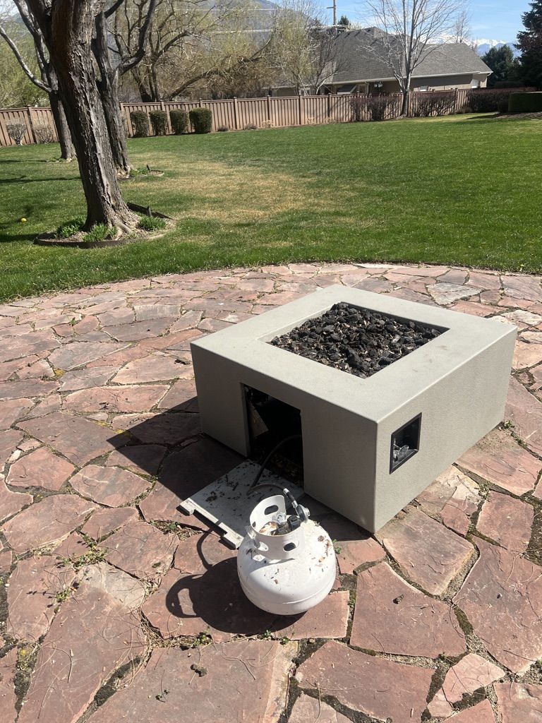 Jensen & Co Fire Pit. Square fire pit. Size is 40x40x19. Comes with a 2.5 gal propane tank, and cover. Retails for over $2700 new at Home Depot. Text with questions. Cash only.