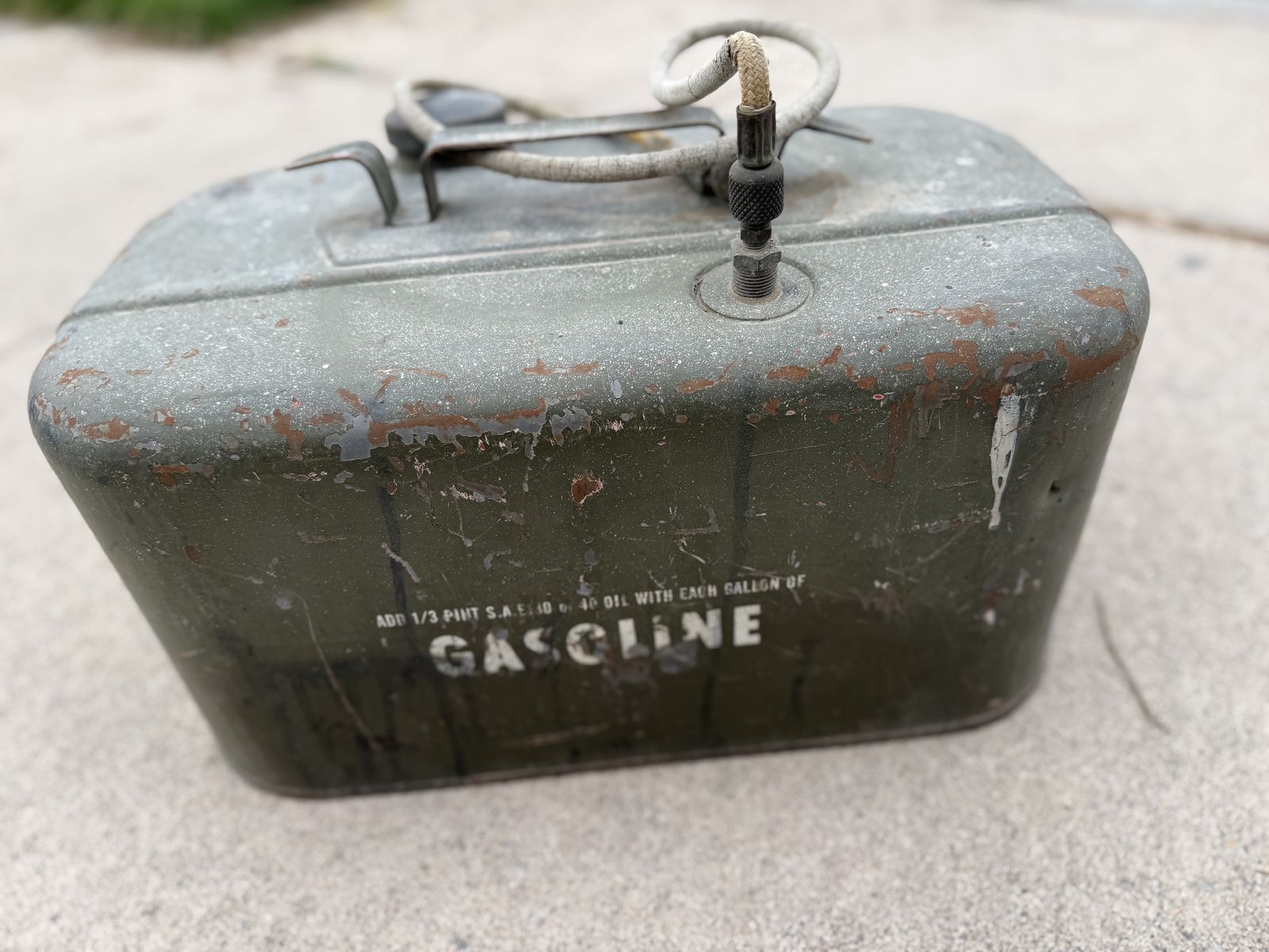VenmoOld surplus military gas can. In good shape. Perfectly clean inside no rust. Probably holds 3 gallons or so.