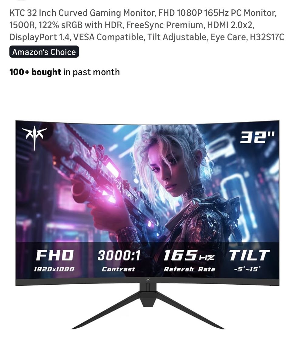 VenmoPair of KTC 32 Inch Curved Gaming Monitor, FHD 1080P 165Hz PC Monitor, 1500R, 122% sRGB with HDR, FreeSync Premium, HDMI 2.0x2, DisplayPort 1.4, VESA Compatible, Tilt Adjustable, Eye Care, H32S17C. $50 Each or obo.