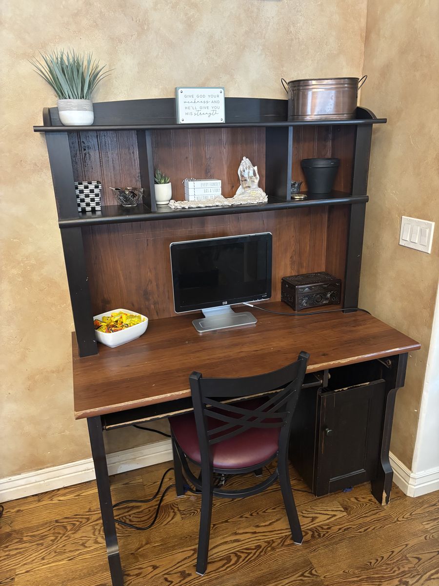 Desk workout stuff that’s on it. Missing drawer front on right side.
