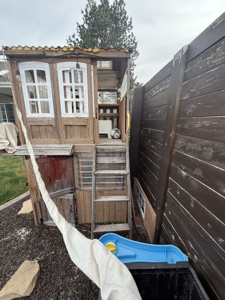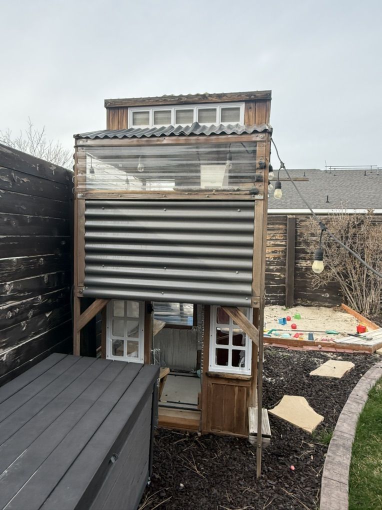 This is about 4 years old- our kids don’t play with it anymore. Lots of modifications to try and enclose it for colder months. If you want to save a lot of money you could take this and fix it up. Must pick up in Sandy- will have to take apart some to get it out of our gate or lift it over the fence.