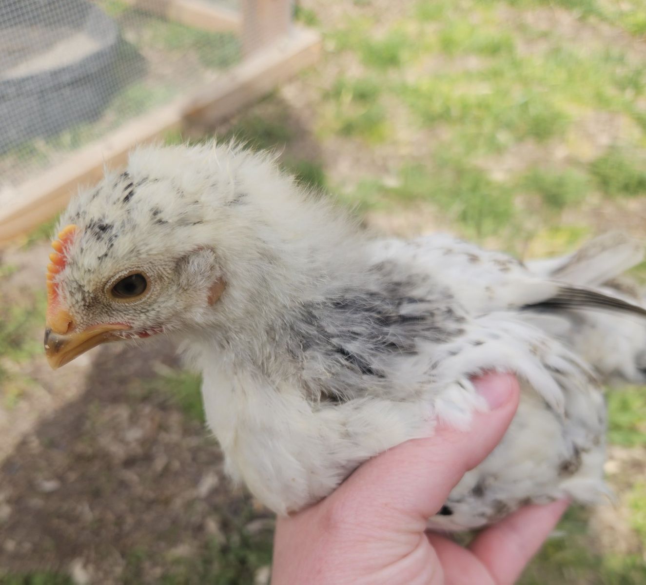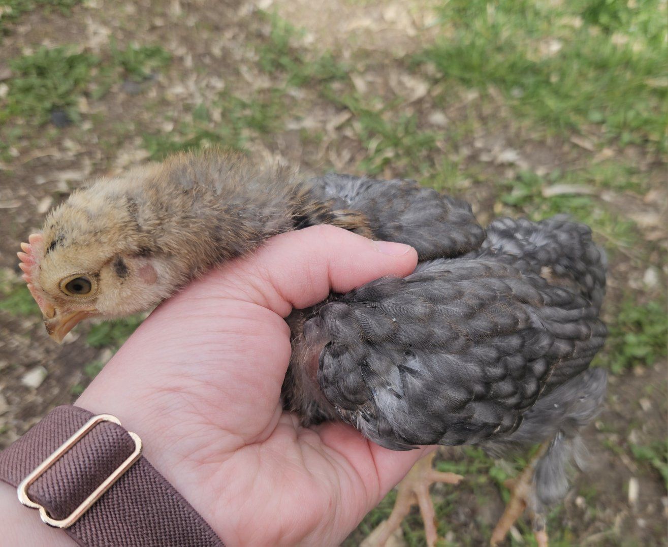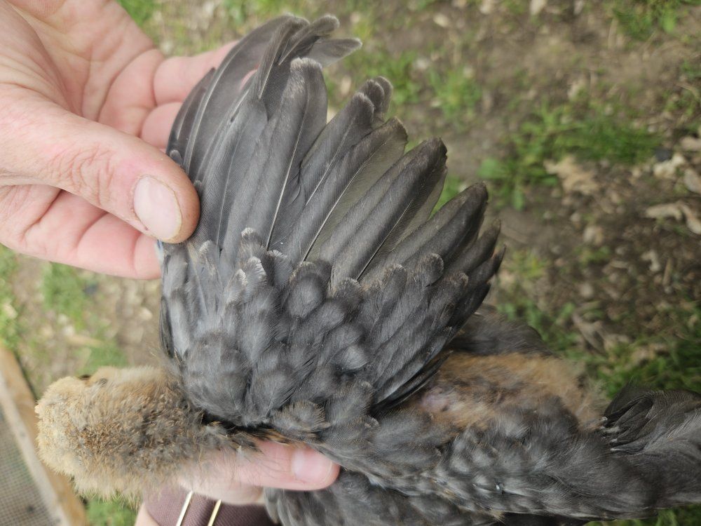 1 smaller dark grey with feathered legs (hatched from blue egg)