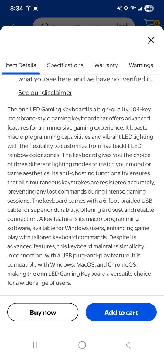 ZelleThe onn LED Gaming Keyboard is a high-quality, 104-kev membrane-style gaming keyboard that offers advancec features for an immersive gaming experience. It boasts macro programming capabilities and vibrant LED lightinc with the flexibility to customize from five backlit LED rainbow color zones. The kevboard aives vou the choice of three different liahting modes to match vour mood or game aesthetics. Its anti-ghosting functionality ensures that all simultaneous kevstrokes are registered accurately preventing any lost commands during intense gamino sessions. The kevboard comes with a 6-foot braided USE cable for superior durability. offering a robust and reliable connection. A key feature is its macro programming software, available for Windows users, enhancing game play with tailored kevboard commands. Despite its advanced features, this keyboard maintains simplicity in connection, with a USB plug-and-play feature. It is compatible with Windows. MacOS. and ChromeOS making the onn LED Gaming Keyboard a versatile choice for a wide range of users.