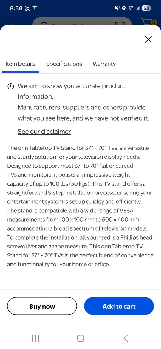 ZelleThe onn Tabletop TV Stand for 37" - 70" TVs is a versatile and sturdy solution for your television display needs. Designed to support most 37" to 70" flat or curved TVs and monitors, it boasts an impressive weight capacity of up to 100 lbs (50 kgs). This TV stand offers a straightforward 5-step i installation process, ensuring your entertainment system is set up quickly and efficiently. The stand is compatible with a wide range of VESA measurements from 100 x 100 mm to 600 x 400 mm, accommodating a broad spectrum of television models. To complete the installation, allyou need is a Phillips head screwdriver and a tape measure. This onn Tabletop TV Stand for 37" - 70" TVs is the perfect blend of convenience and functionality for your home or office.