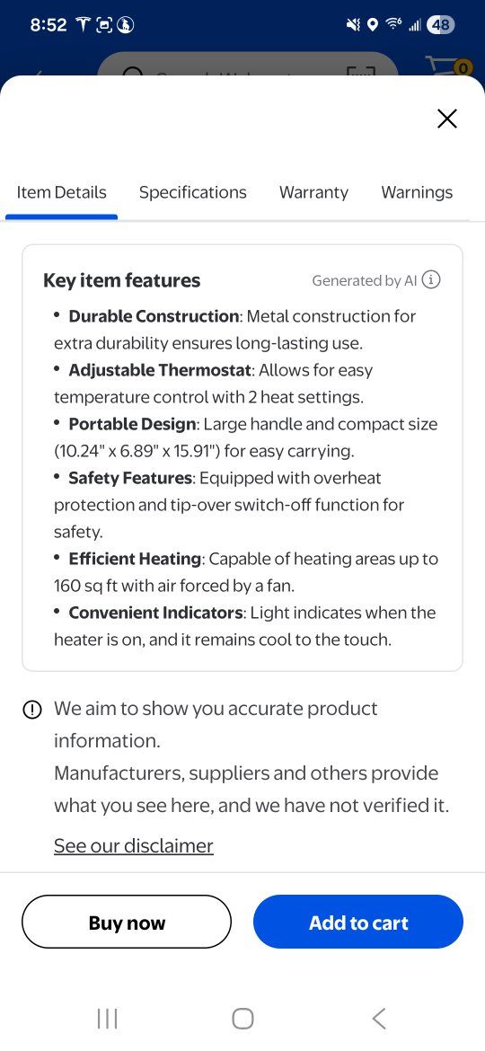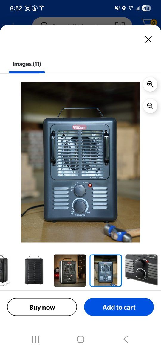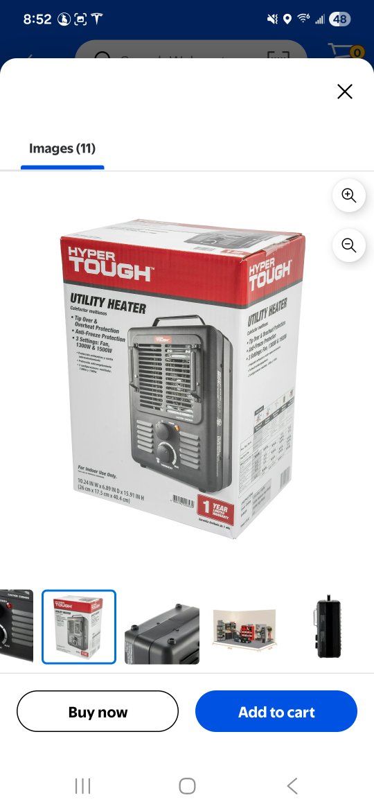 ZelleDurable Construction: Metal construction for extra durability ensures long-lasting use, • Adiustable Thermostat: Allows for easy temperature control with 2 heat settings. • Portable Design: Large handle and compact size (10.24" x 6.89" x 15.91") for easy carrying. • Safety Features: Equipped with overheat protection and tip-over switch-off function for safety. • Efficient Heating: Capable of heating areas up to 160 sa ft with air forced by a fan. • Convenient Indicators: Liaht indicates when the heater is on. and it remains cool to the touch.