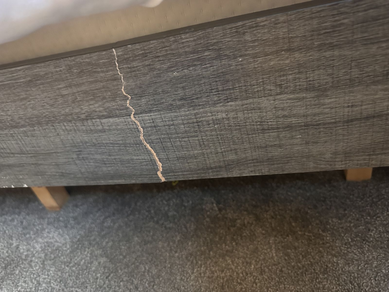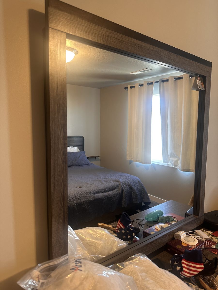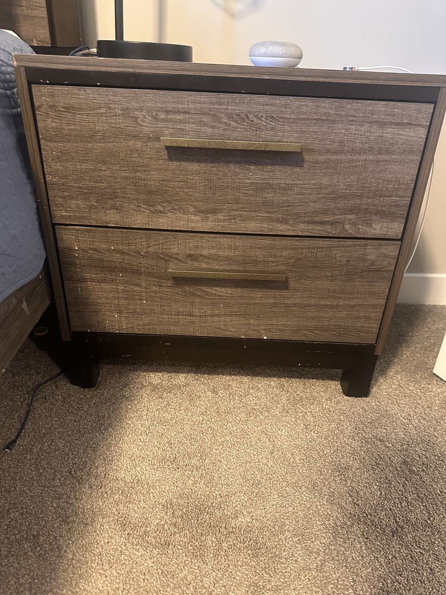 ZelleSome wear and tear started to have a crack on the side that my husband repaired it. Works great. Dresser drawers are a little wonky but not an issue. Need gone ASAP. Comes with king size bed frame, two nightstands, dresser, and mirror.