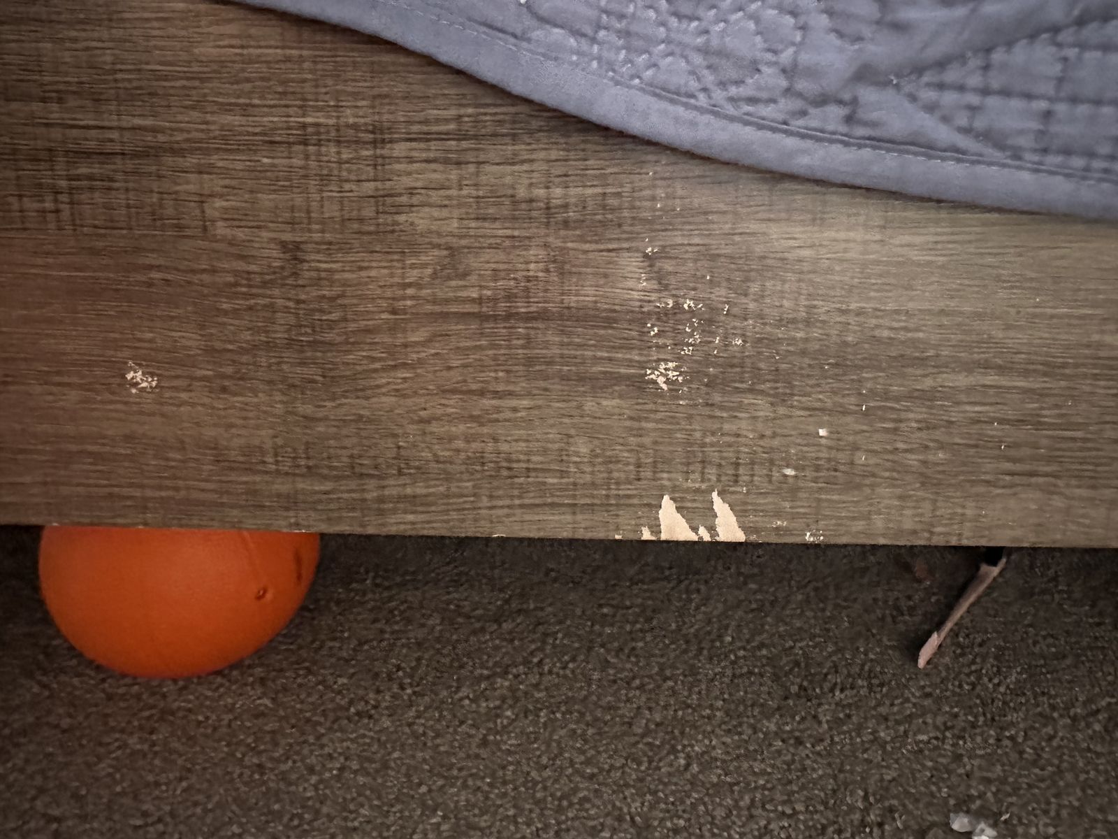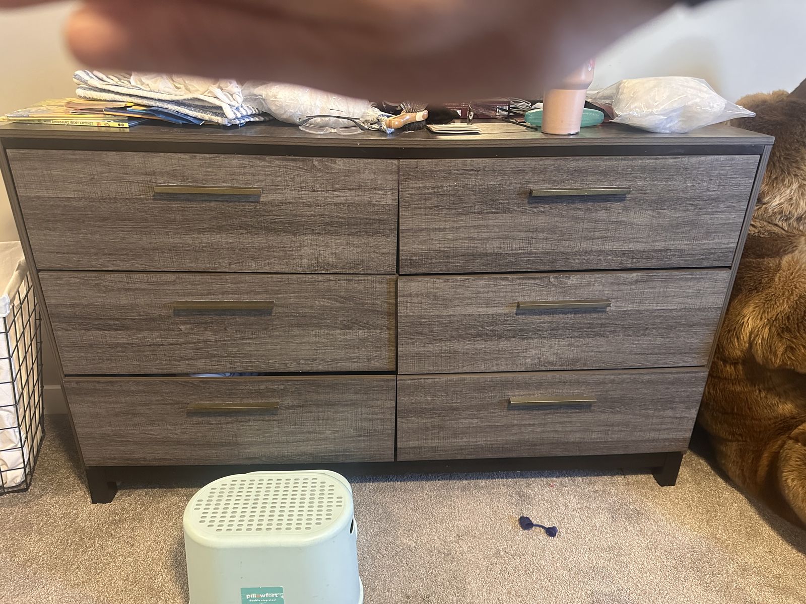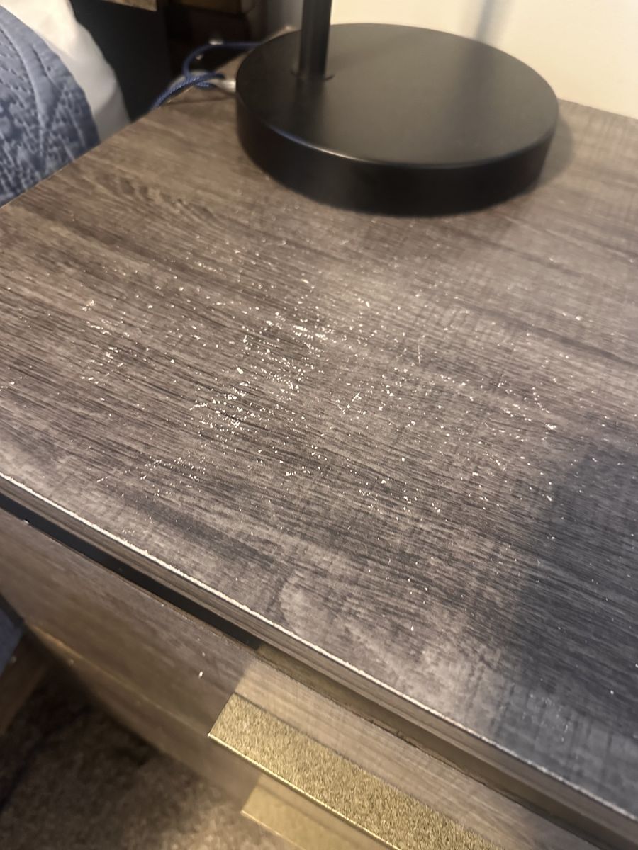 ZelleSome wear and tear started to have a crack on the side that my husband repaired it. Works great. Dresser drawers are a little wonky but not an issue. Need gone ASAP. Comes with king size bed frame, two nightstands, dresser, and mirror.