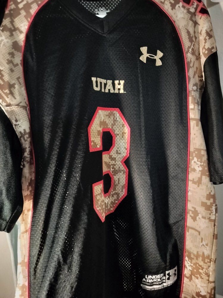 Under Armour Utah Utes football jersey in black with desert camo sleeves. “Salute to Service / Wounded Warrior” style with “Courage” on the back.