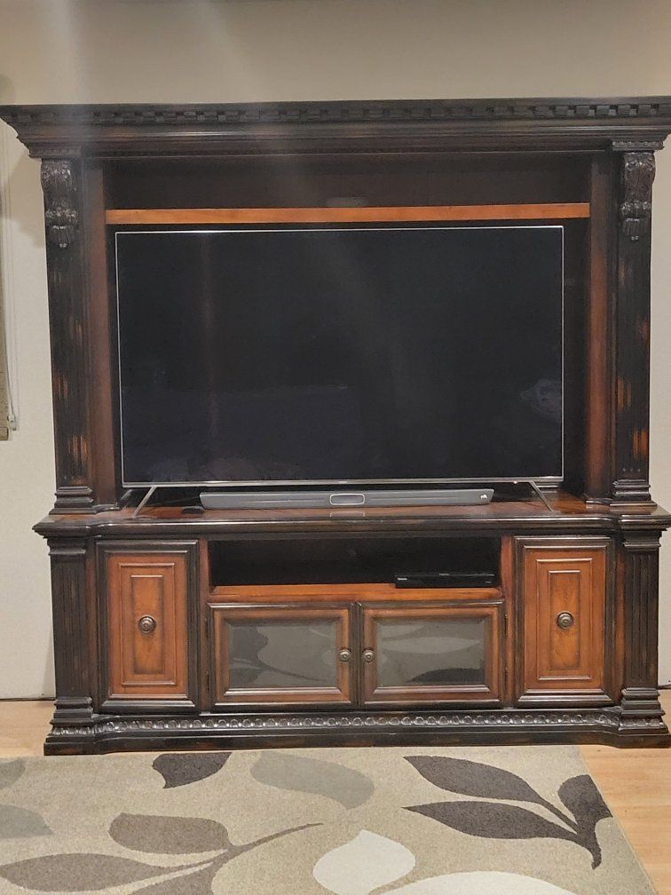 Grand Estates Entertainment Center Console H 30" W 80" D 24" Hutch H 51" W 84" D 22" fits a 65" TV. TV shown in picture is NOT included. Can't deliver, so you'll have to come pick it up. Asking $650 (originally $1800), but price isn't set in stone. ksl messenger works best as I can't always answer the phone. located in Plain City, about 3 miles west of Smith and Edwards.
