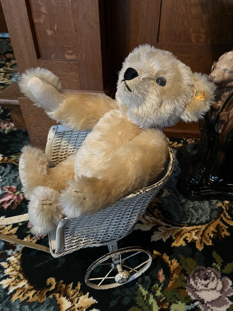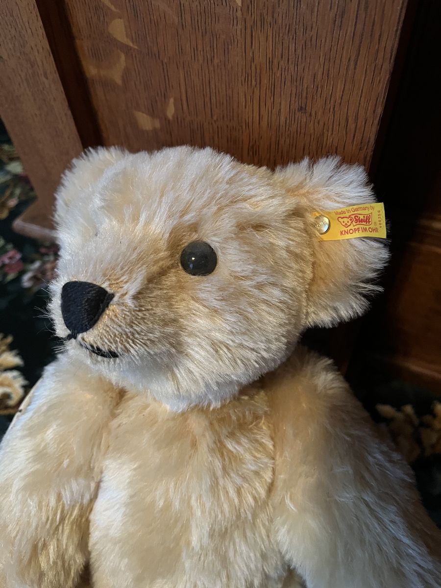 VenmoThis is one stunning teddy bear! It is a reproduction of the original 1909 design. This has the KNOPFIM OHR ear tag/button in the ear. That states it was made in Germany. It is number 406256. This is made of genuine high quality blond mohair. This darling bear has jointed arms, legs and head. The eyes are black and the nose and mouth are stitched with a thick black thread. This has a felt type material on the paws. This bear is 17 inches tall. When sitting the bear is 13 inches tall. The taller larger bears like this one, are very hard to locate, especially in this like new condition. One of the world's most beloved toys, the teddy bear, was named in honor of President Theodore Roosevelt, after he refused to shoot a bear during a Mississippi hunting trip in Nov. 1902. This bear has been retired for many years. My mom bought this a very long time ago and it has never been played with. She loved it and only used it for display. This is in excellent condition in a non smoking home. Selling for a parent. Little pull cart is not included. No trades. Price is firm.