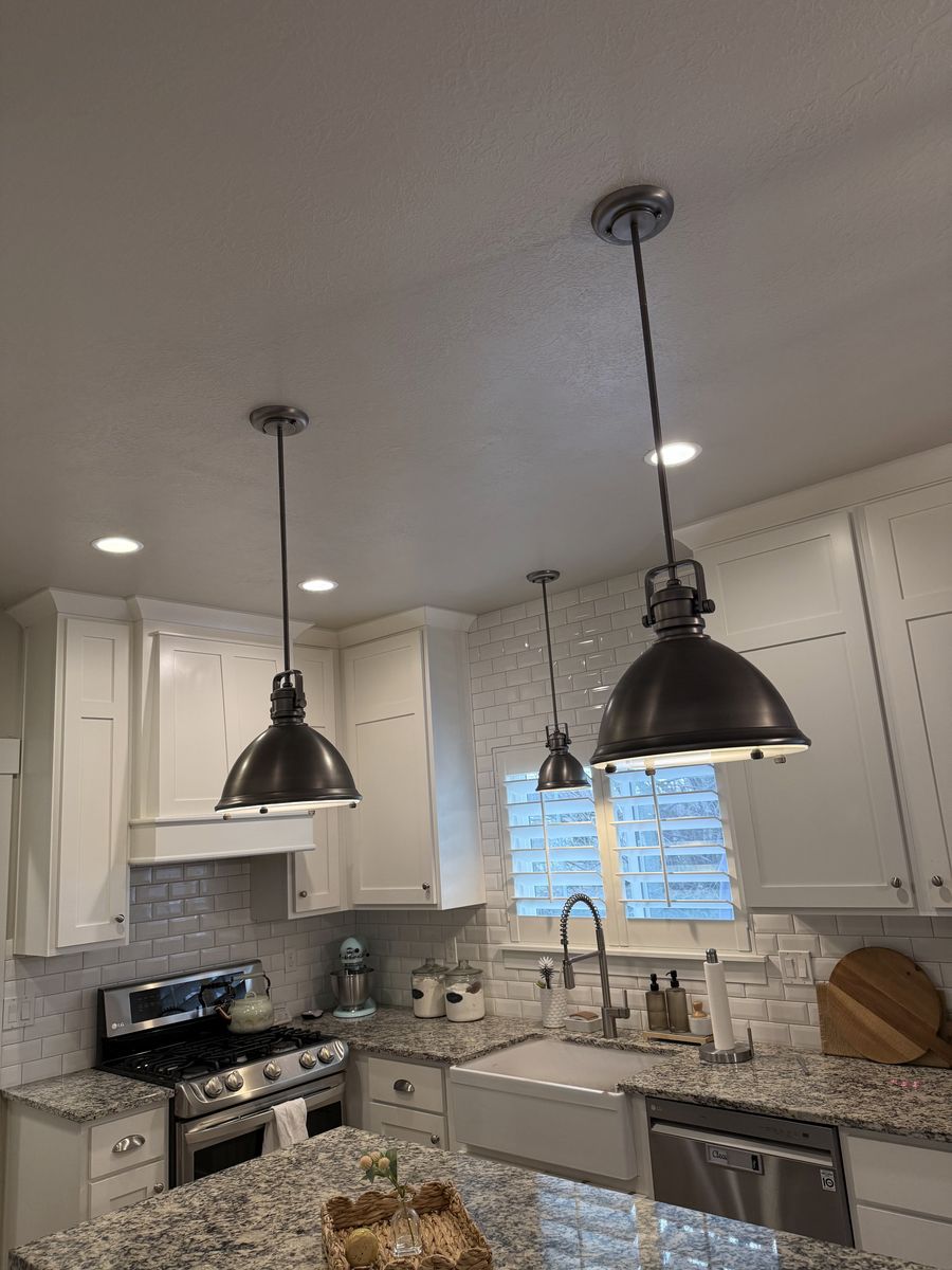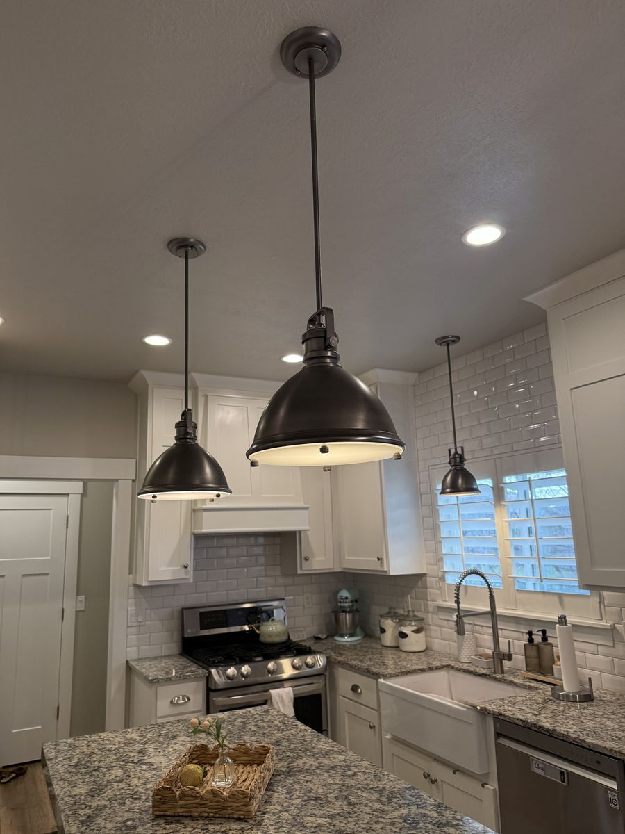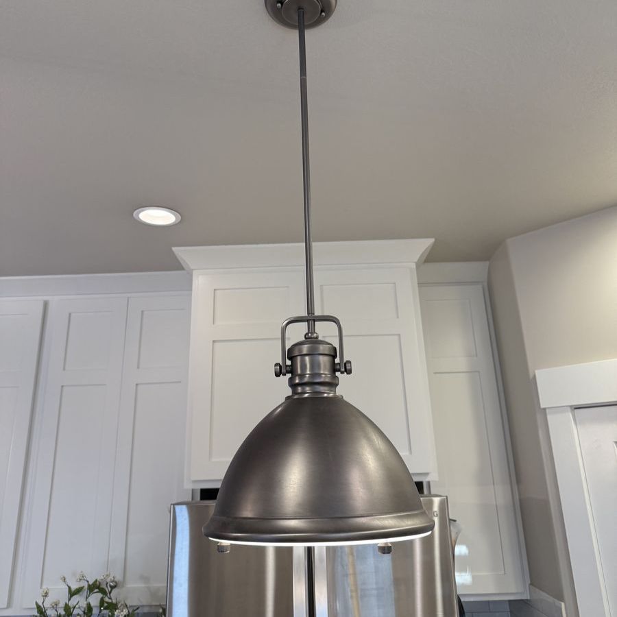 Venmo2 Capital Lighting Pendant lights in brushed nickel. Excellent condition. Work great! They are approx 13” wide at the base and 38.25” in length. I also have a smaller 3rd light that is over the sink that’s available if interested for $150.