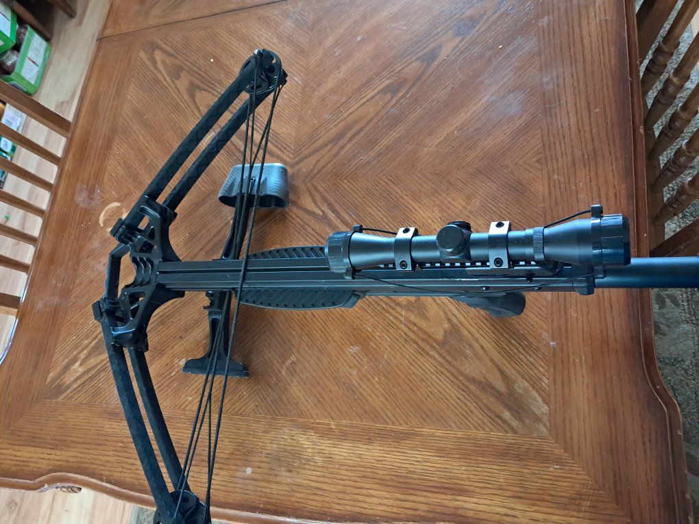 This is a black tactical crossbow. The stock goes in and out like an AR15 stock\n It is a 180 pounds, arrows fly at 410 feet per second, extremely powerful.\n It's brand new, I've only used it 2 or 3 × 2 target practice. Just don't use it enough to keep up, maybe somebody else could Have some fun with it asking 250$ or best offer , please text me with any questions
