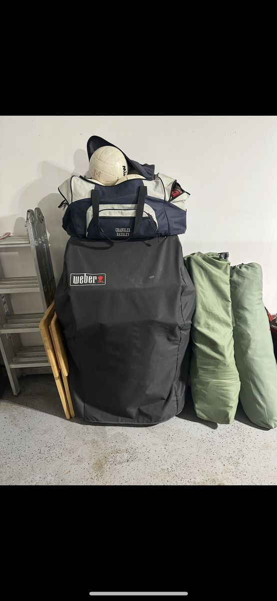 May need a little cleaning as hasn’t been used in a while. Shelves fold down and stores small, comes with cover.